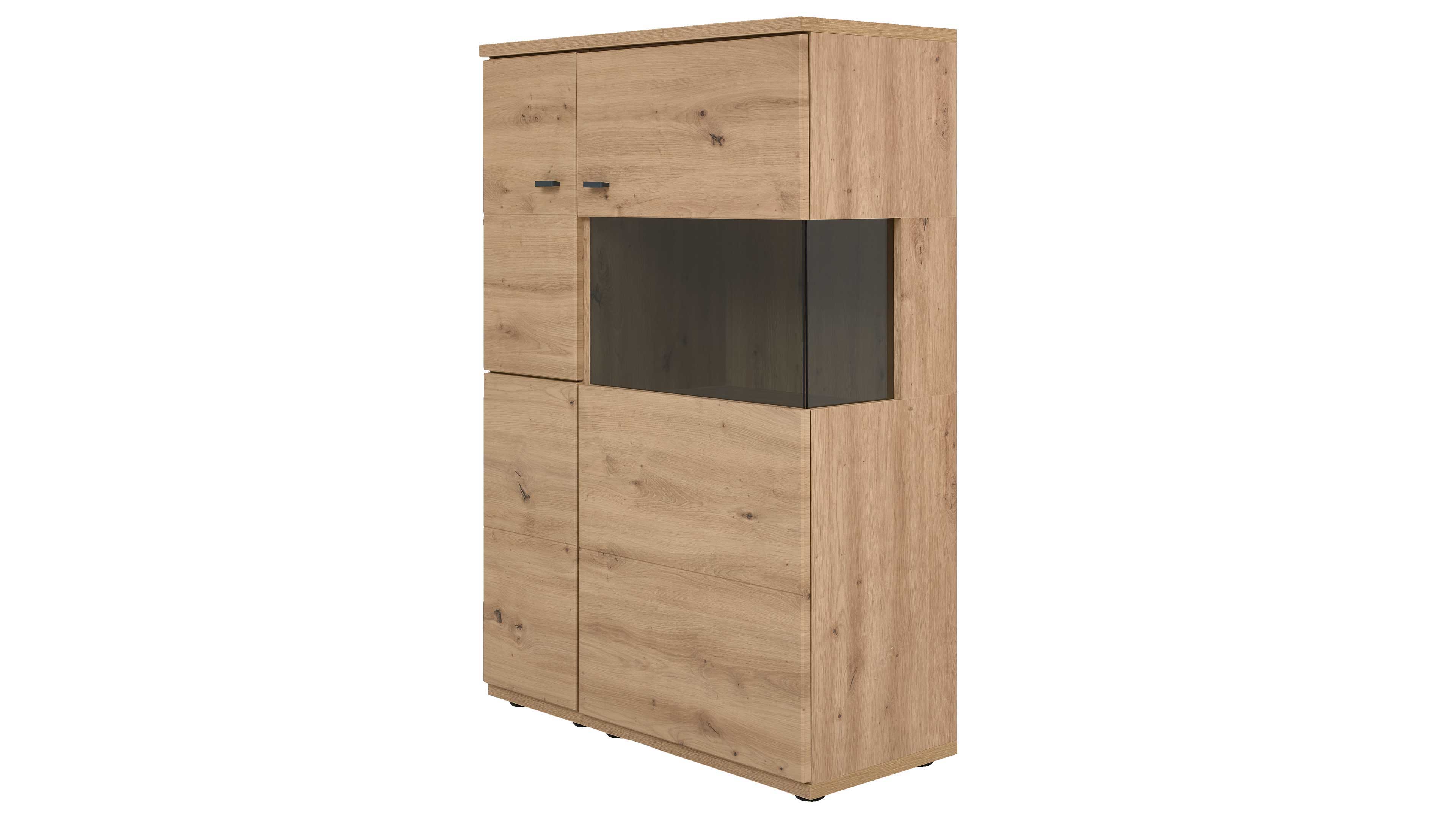 Auf Wunsch lassen sich die Vitrinen mit einer geschroppten Rückwand und einer indirekten LED-Beleuchtung ausstatten. So setzt du gezielte Lichtakzente, betonst die natürliche Maserung der Holzoptik und verleihst deinem Raum zusätzliche Tiefe – für ein stimmungsvolles, modernes Ambiente.