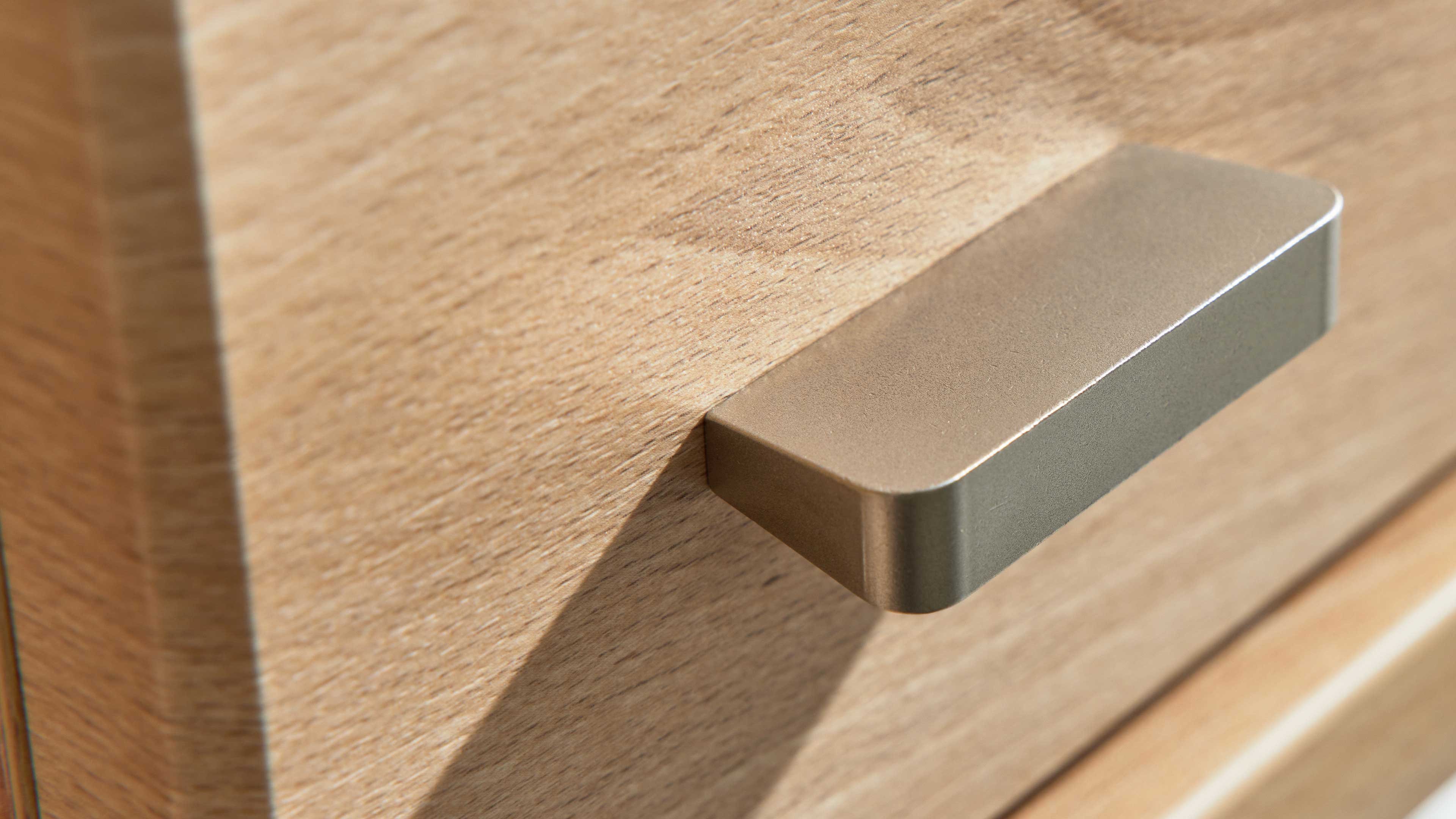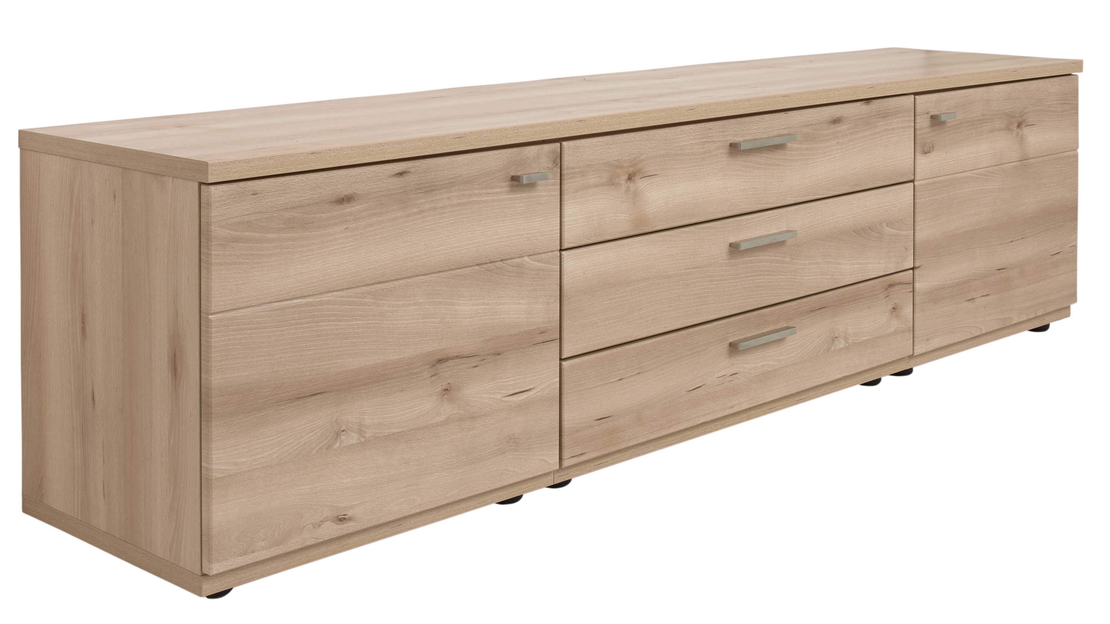 Die melaminbeschichteten Oberflächen der Möbel sind kratzfest, pflegeleicht und damit perfekt für den täglichen Gebrauch geeignet. Türen mit Schließdämpfung und Schubladen mit Soft-Close-Funktion sorgen für leises, komfortables Schließen. Zwei Front- und Griffvarianten stehen zur Auswahl, sodass du die Wohnwand individuell an deinen Stil anpassen kannst.