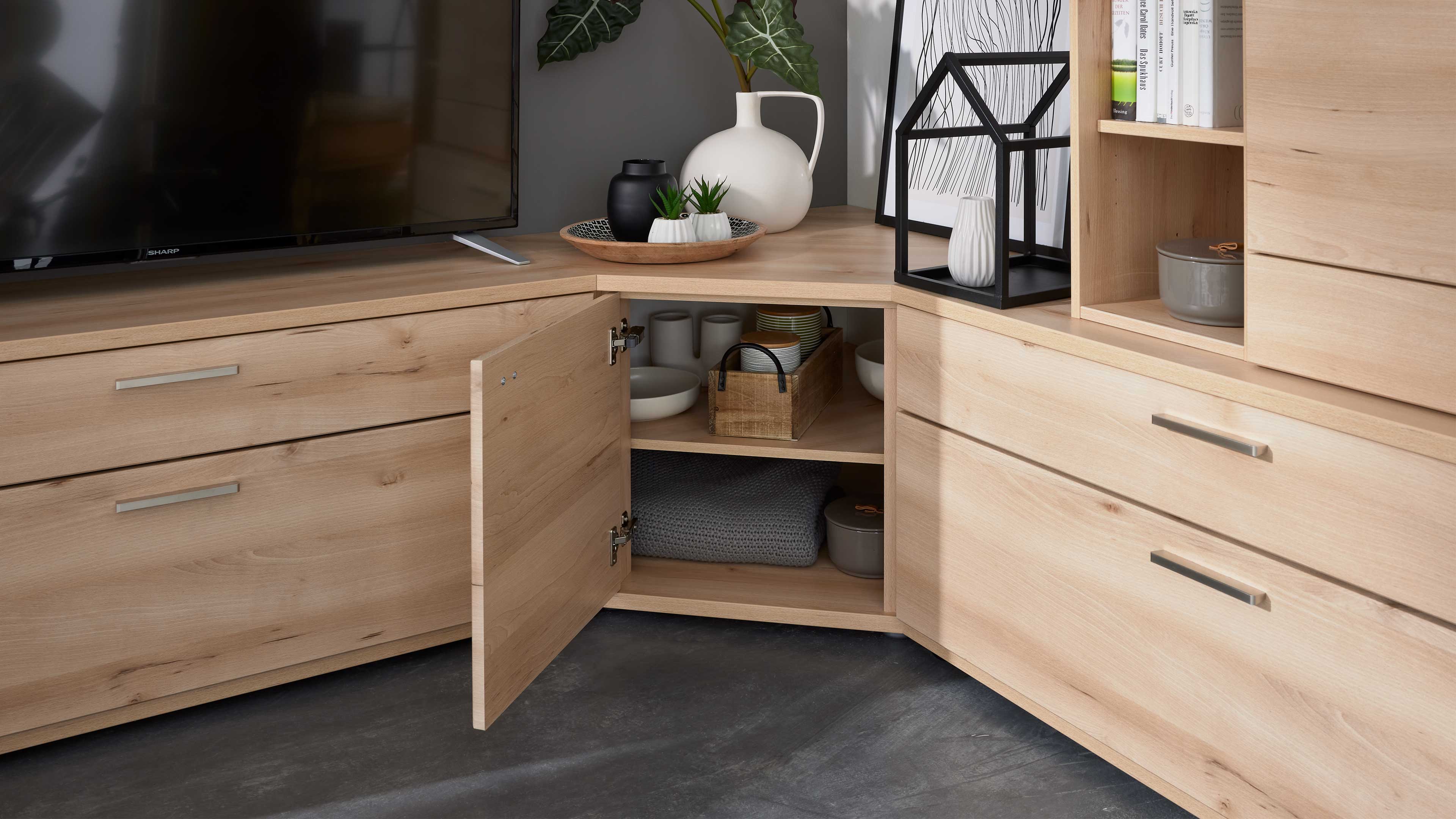 Das Lowboard mit Maßen von ca. 120 x 55 x 45 cm (B/LxHxT) ist mit zwei innen geteilten Schubladen ausgestattet und bietet großzügigen Platz für TV-Geräte bis 86 Zoll. Hier finden Technik, Zubehör oder Zeitschriften ihren Platz – ordentlich, übersichtlich und bequem zugänglich. Das Eckelement mit einer Tür und einem Holzboden misst ca. 77 x 55 x 77 cm (B/LxHxT) und verbindet die einzelnen Möbelteile harmonisch miteinander. Gleichzeitig nutzt es den vorhandenen Raum optimal aus – perfekt für kleine Ecken und Übergänge.