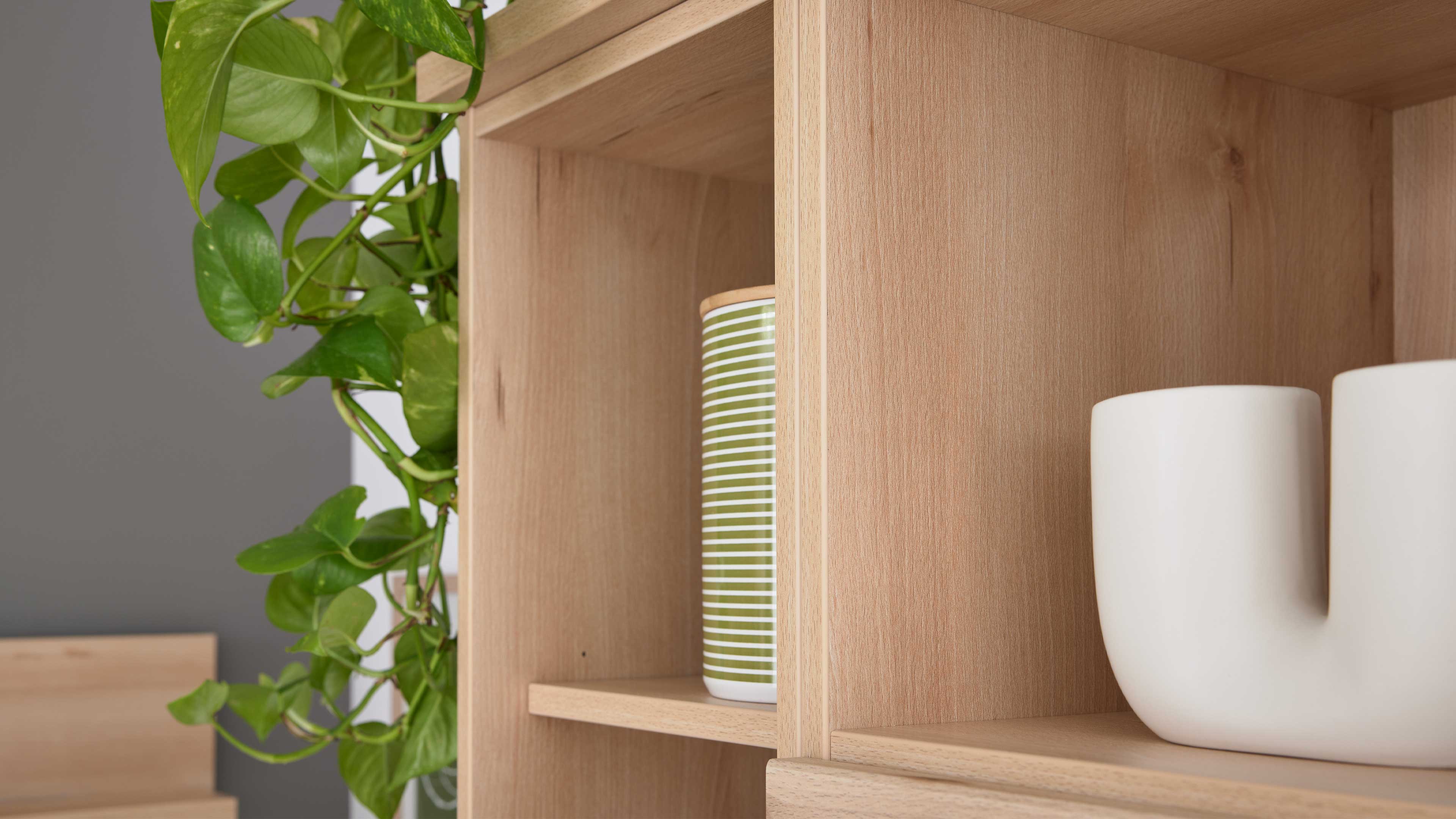 Wohnwand als Eck-Kombination mit offenem Regal und Vitrine in Naturbuche