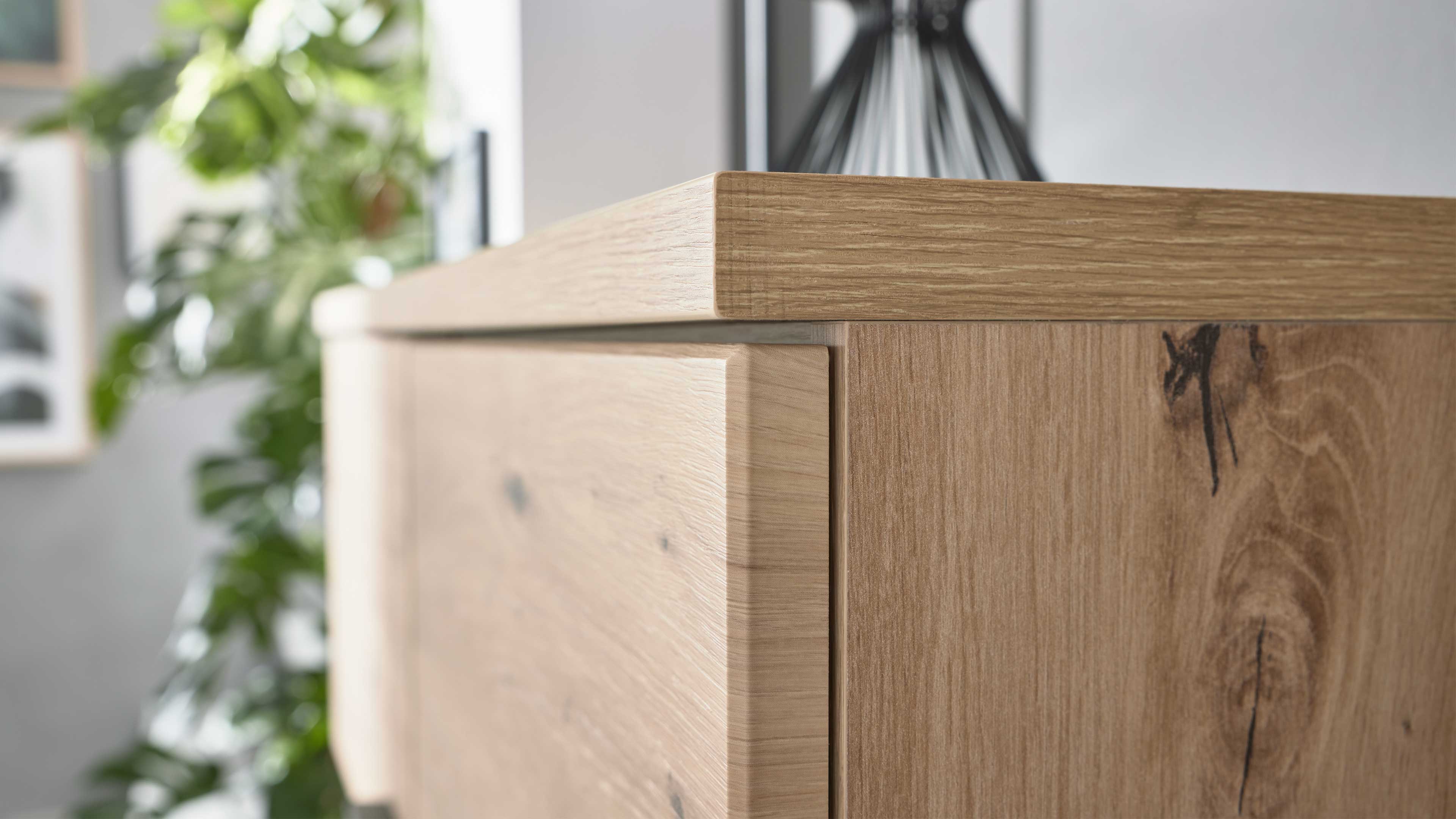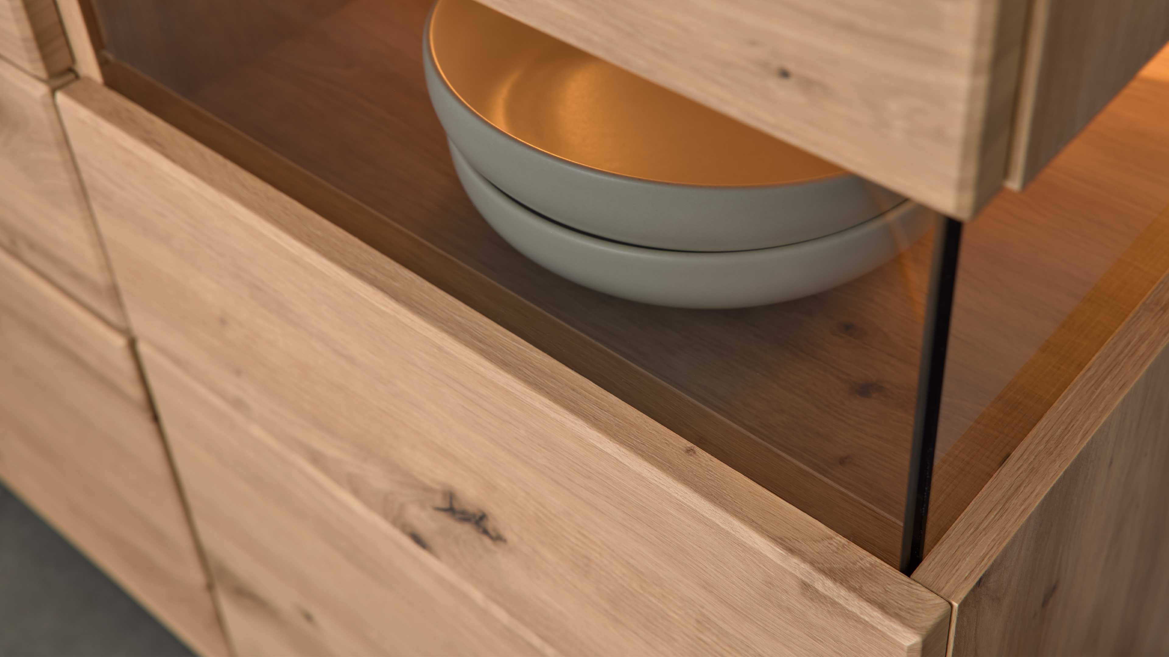 Die melaminbeschichteten Oberflächen sind robust, kratzfest und pflegeleicht – ideal für den Alltag. Türen und Schubladen schließen dank Soft-Close-Funktion und Schließdämpfung angenehm sanft und leise. Wähle aus zwei Front- und Griffvarianten, um dein Möbel perfekt auf deinen Stil abzustimmen. Für noch mehr Atmosphäre lassen sich die Vitrinen optional mit einer geschroppten Rückwand und LED-Beleuchtung ausstatten – für stimmungsvolle Akzente und mehr Tiefe im Raum.