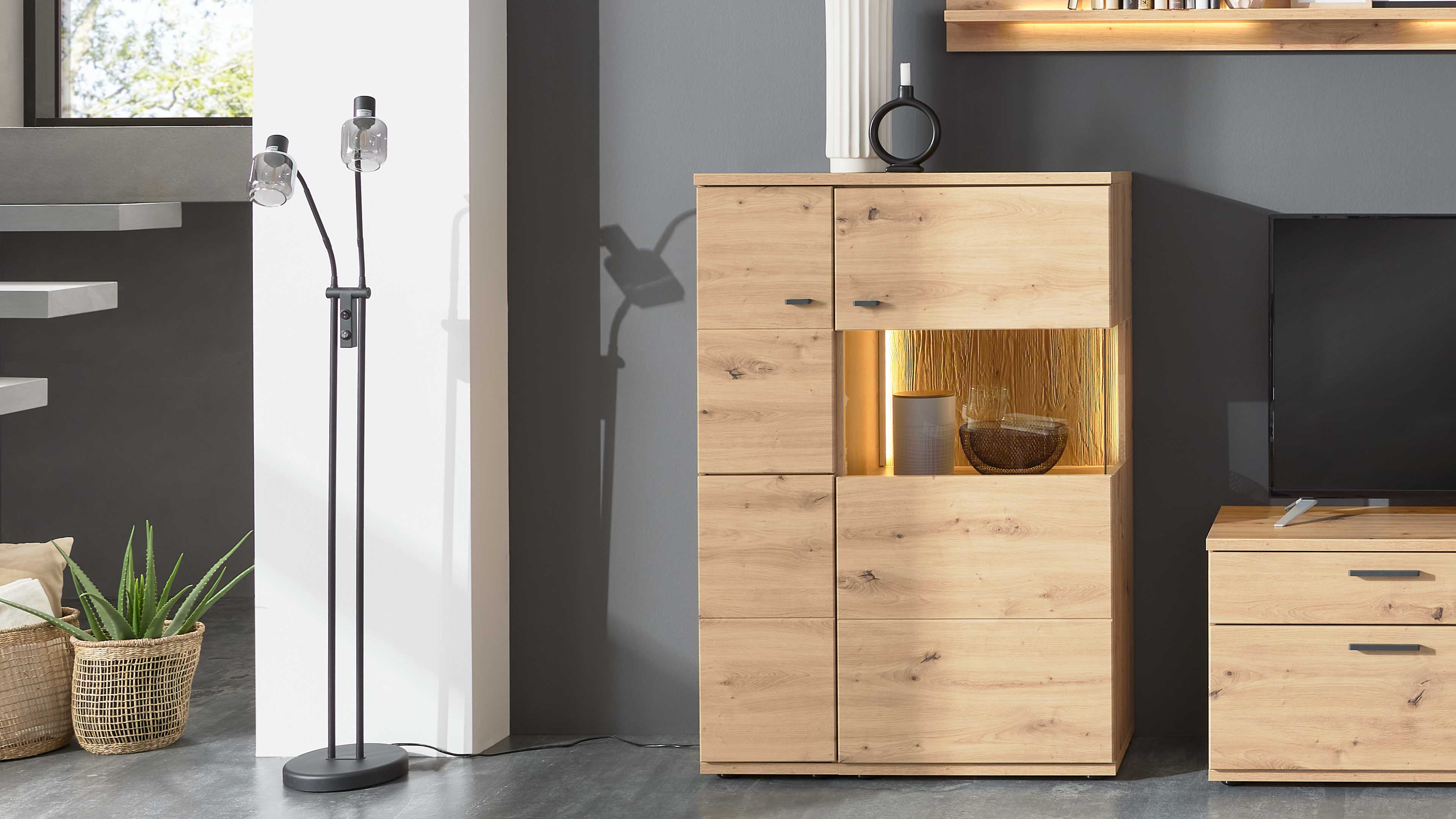 Die Kombination aus warmer Alteiche-Nachbildung, edlem grau getöntem Parsolglas und anthrazitfarbenen Metallgriffen verleiht der Interliving Wohnzimmer Serie 2110 eine moderne, gemütliche Ausstrahlung. Sie bringt Struktur, Stil und Funktion perfekt in Einklang – und schenkt dir dabei jede Menge durchdachten Stauraum für ein aufgeräumtes, harmonisches Wohngefühl.