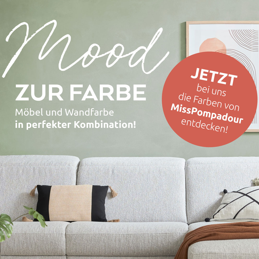 Ob neue Wandfarbe für dein Wohnzimmer oder ein sanfter Ton fürs Schlafzimmer – mit den Farben von MissPompadour und den passenden Interliving Möbeln bringst du deinen Stil ganz natürlich zur Geltung.