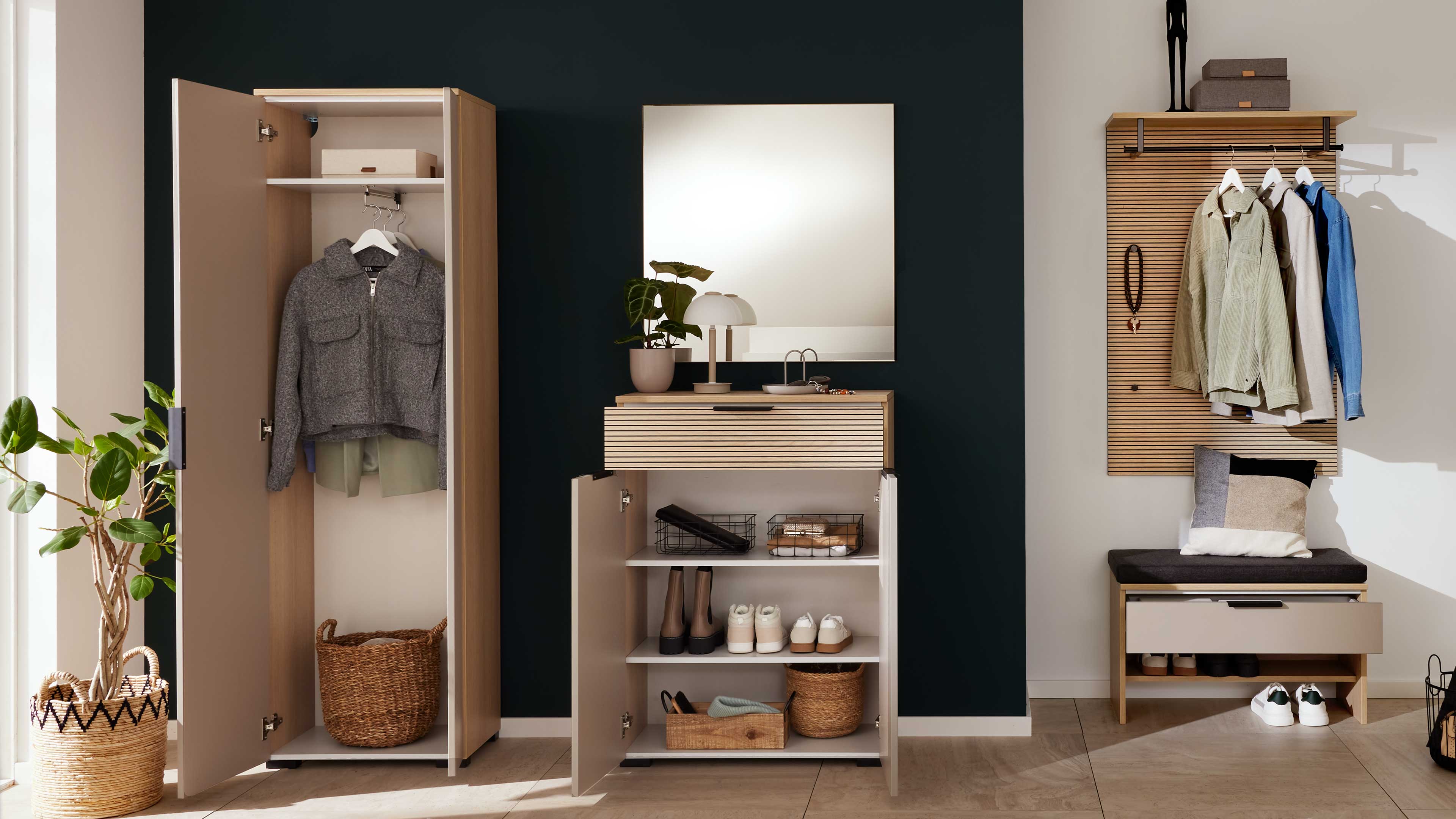 Das komplette Dielenmöbel-Set bietet dir funktionalen Stauraum, klare Linien und vielseitige Gestaltungsmöglichkeiten – perfekt für eine aufgeräumte, einladende Garderobe.