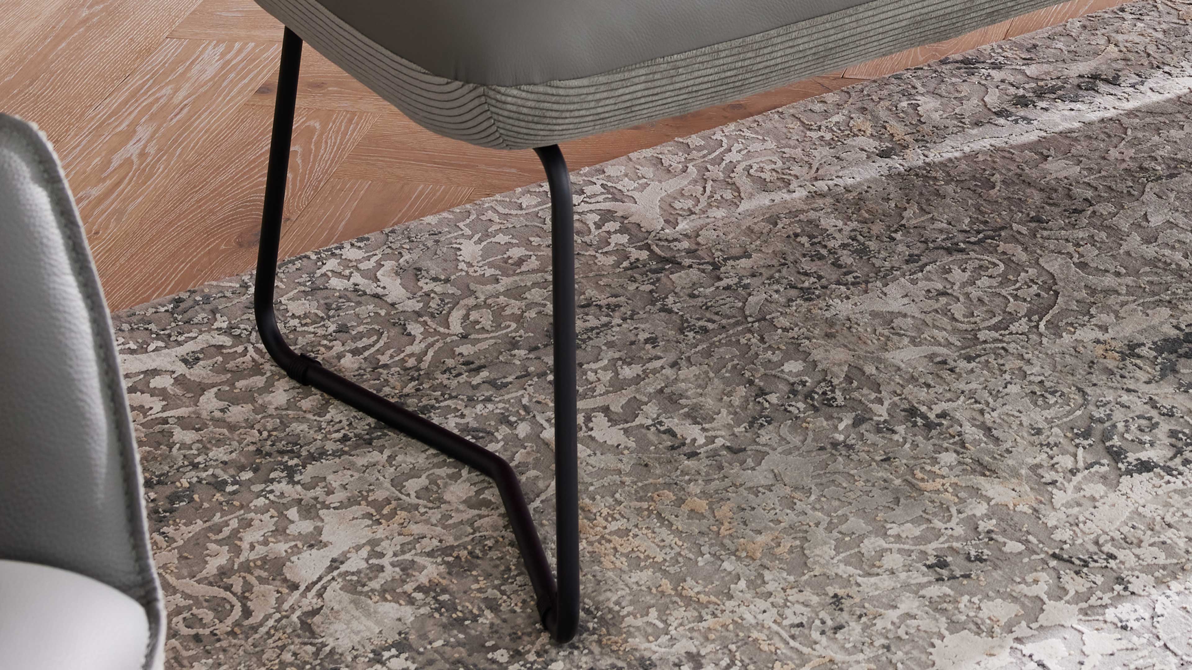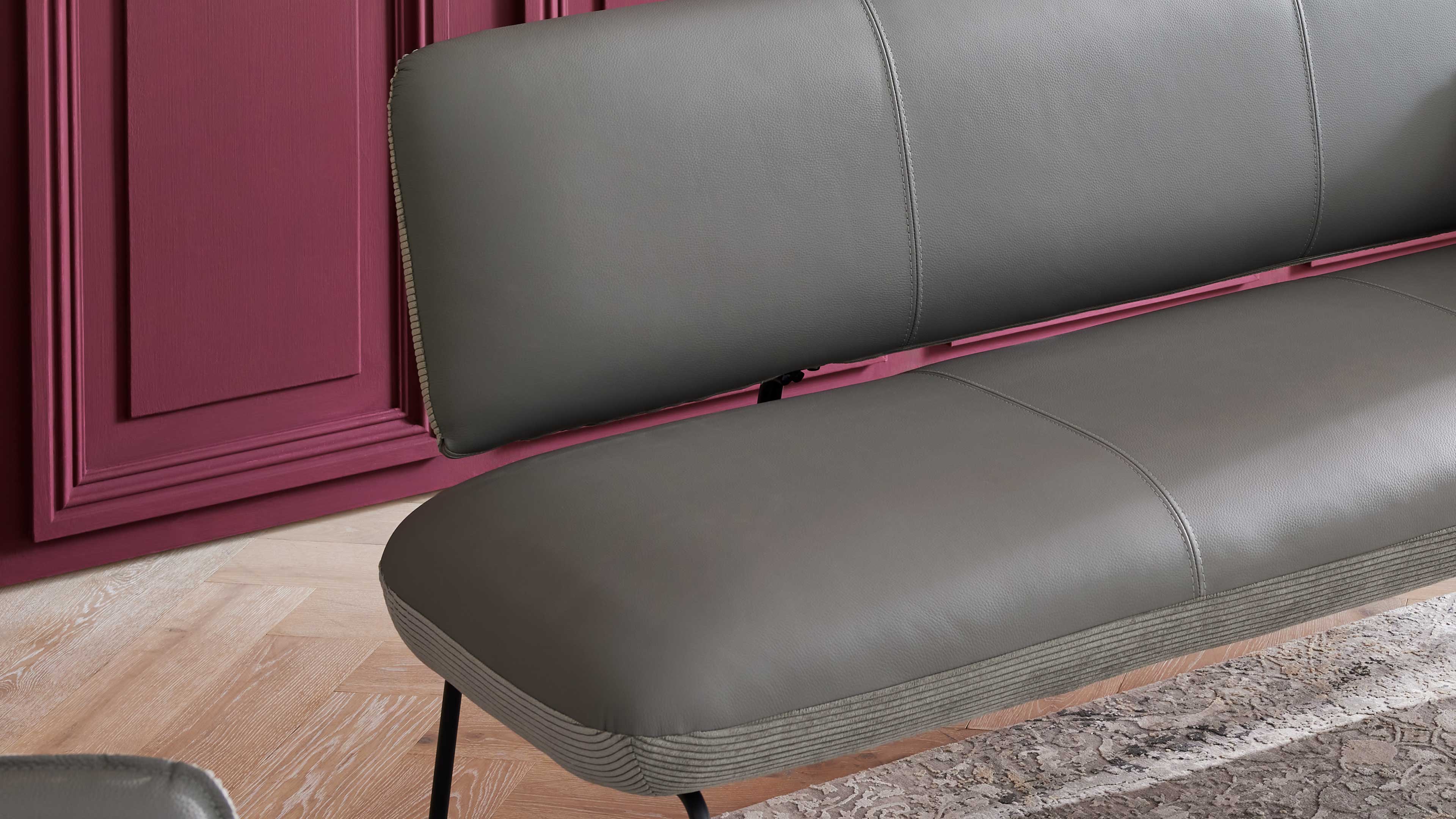 Setze die Polsterbank gezielt als stilvollen Kontrast zu einzelnen Stühlen ein oder nutze sie als durchgehende Sitzlösung für eine moderne, kommunikative Essgruppe. Der Mix aus Leder und Cord bringt dabei Struktur und Wärme in deinen Raum.