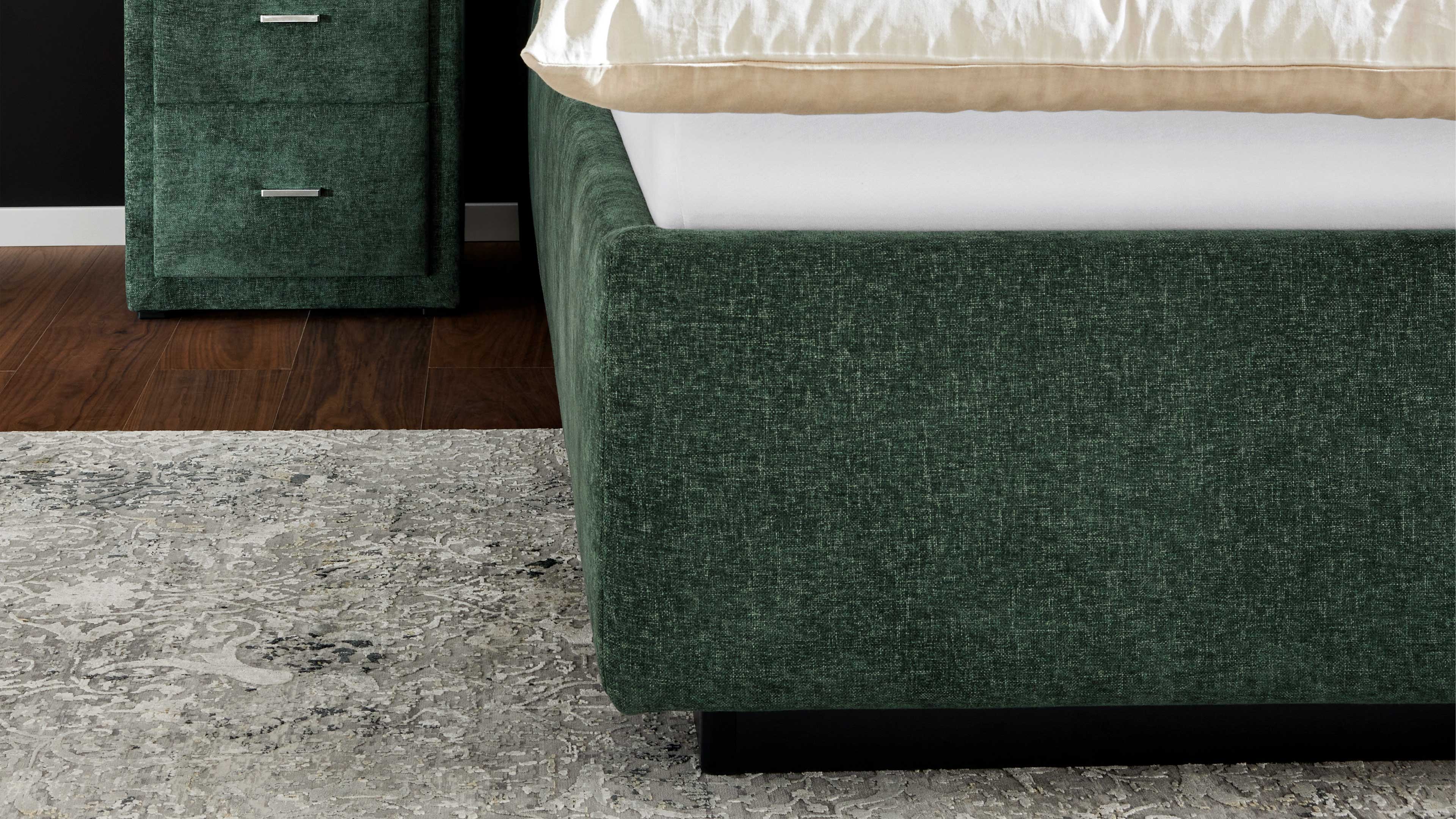 Modernes Polsterbett in grünem Stoff mit gepolstertem Kopfteil und praktischem Bettkasten für zusätzlichen Stauraum