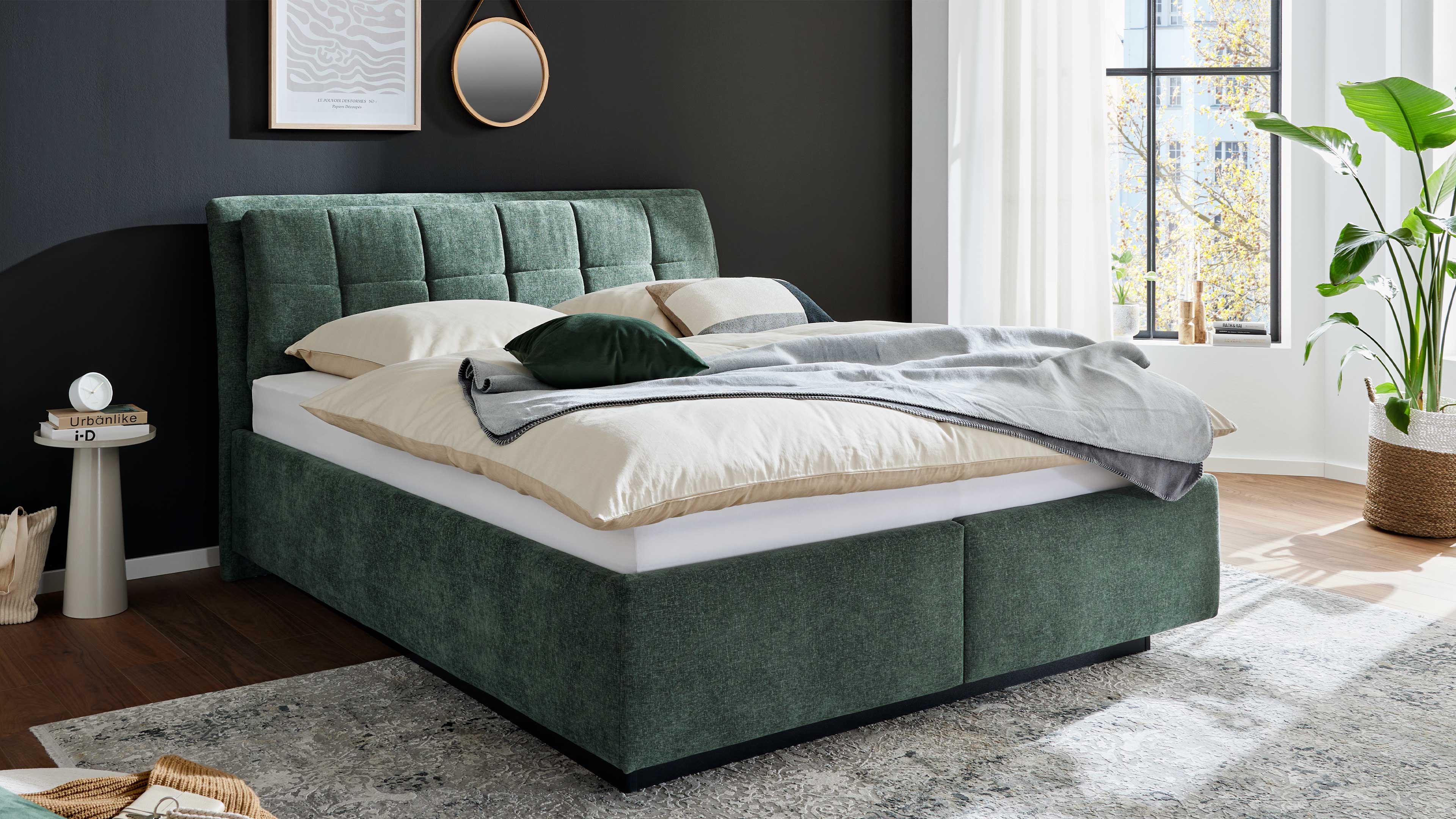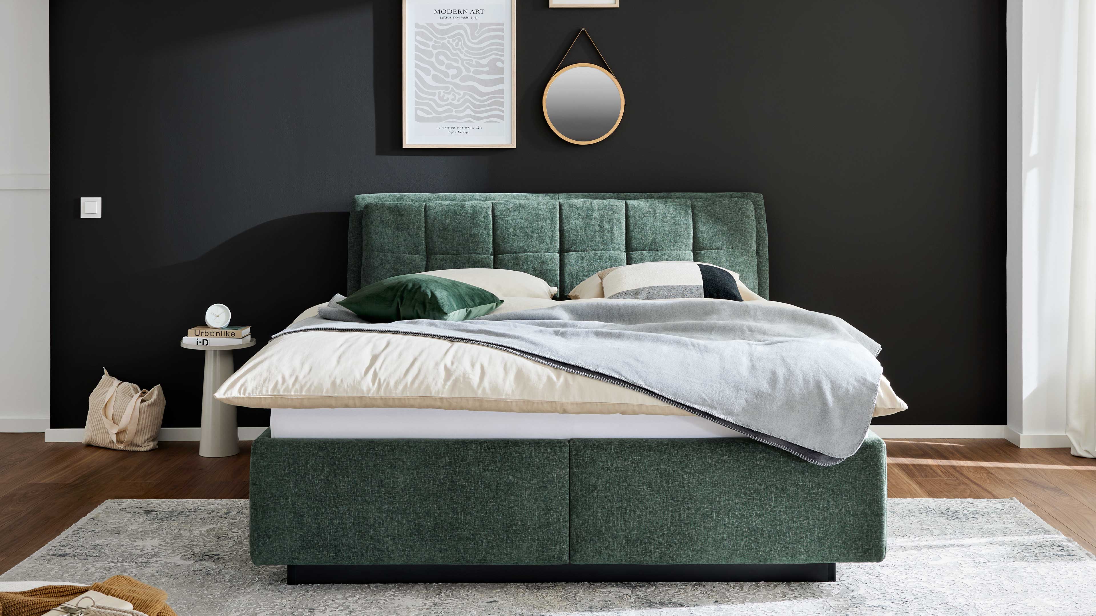 - moosgrünes Polsterbett mit Bettkästen, 180 x 200 cm