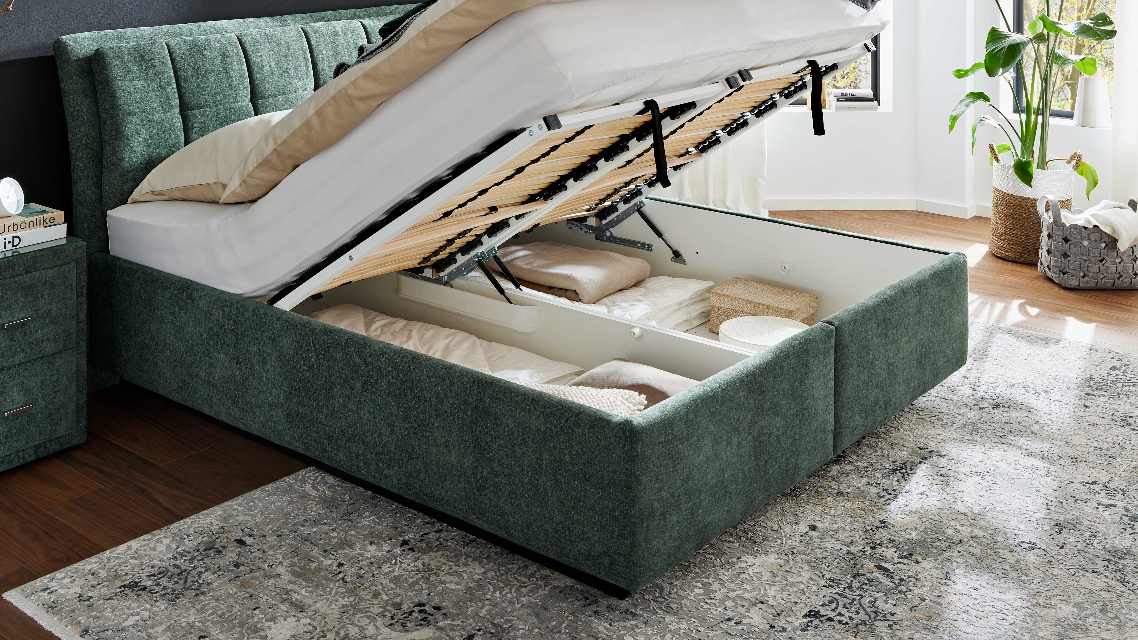 Der Bettkasten eignet sich ideal für saisonale Textilien – so bleibt dein Schlafzimmer aufgeräumt und strukturiert.