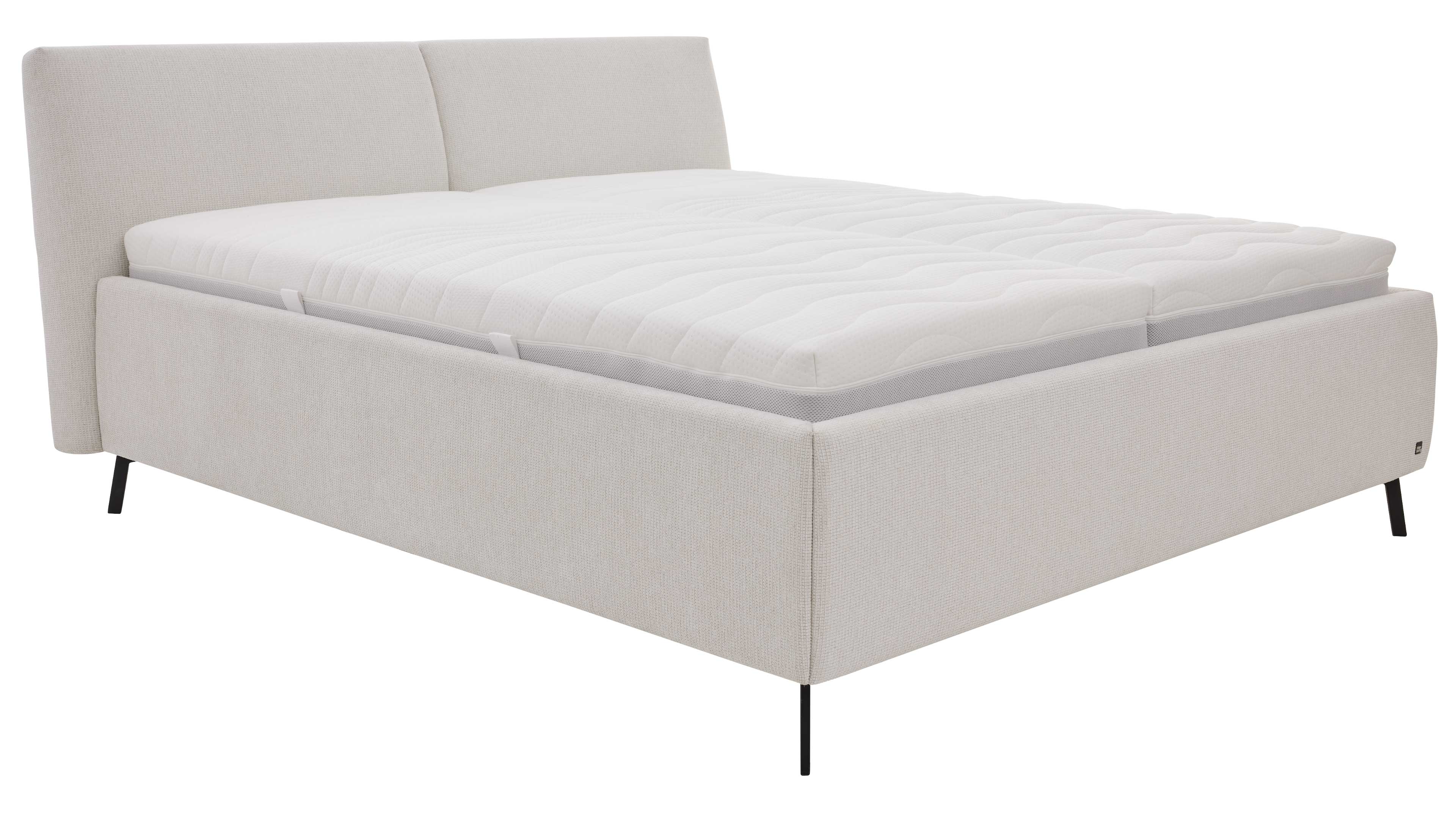 Modernes Polsterbett in hellem Stoff mit gepolstertem Kopfteil und filigranen Metallfüßen