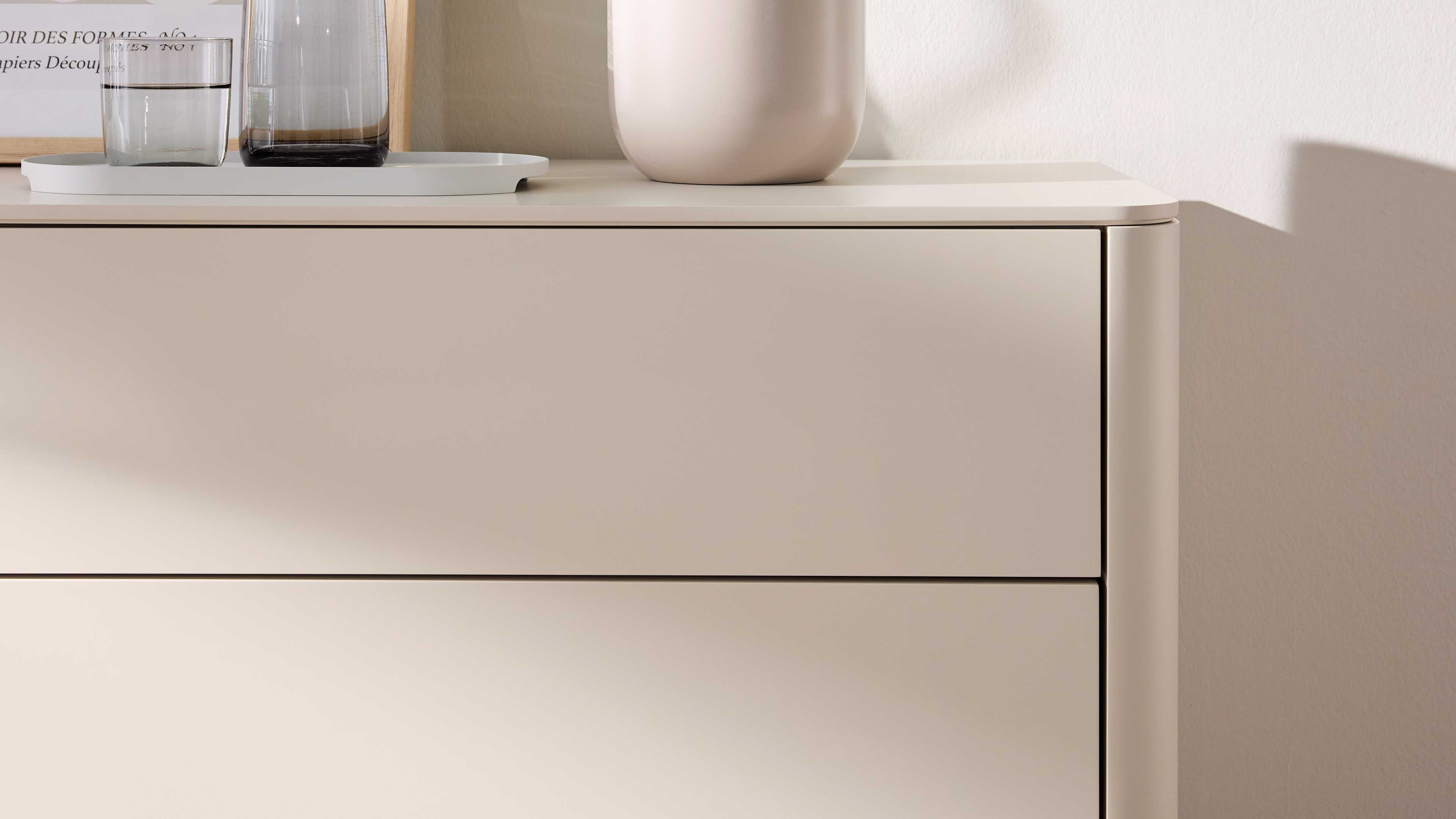 Hinter zwei Türen und in drei geräumigen Schubladen findest du durchdachten Stauraum für unterschiedlichste Bedürfnisse. Die Fronten mit Push-to-Open-Funktion sorgen für eine grifflose, puristische Optik und lassen sich komfortabel durch sanften Druck öffnen. So bleibt das Design ruhig, klar und besonders hochwertig.