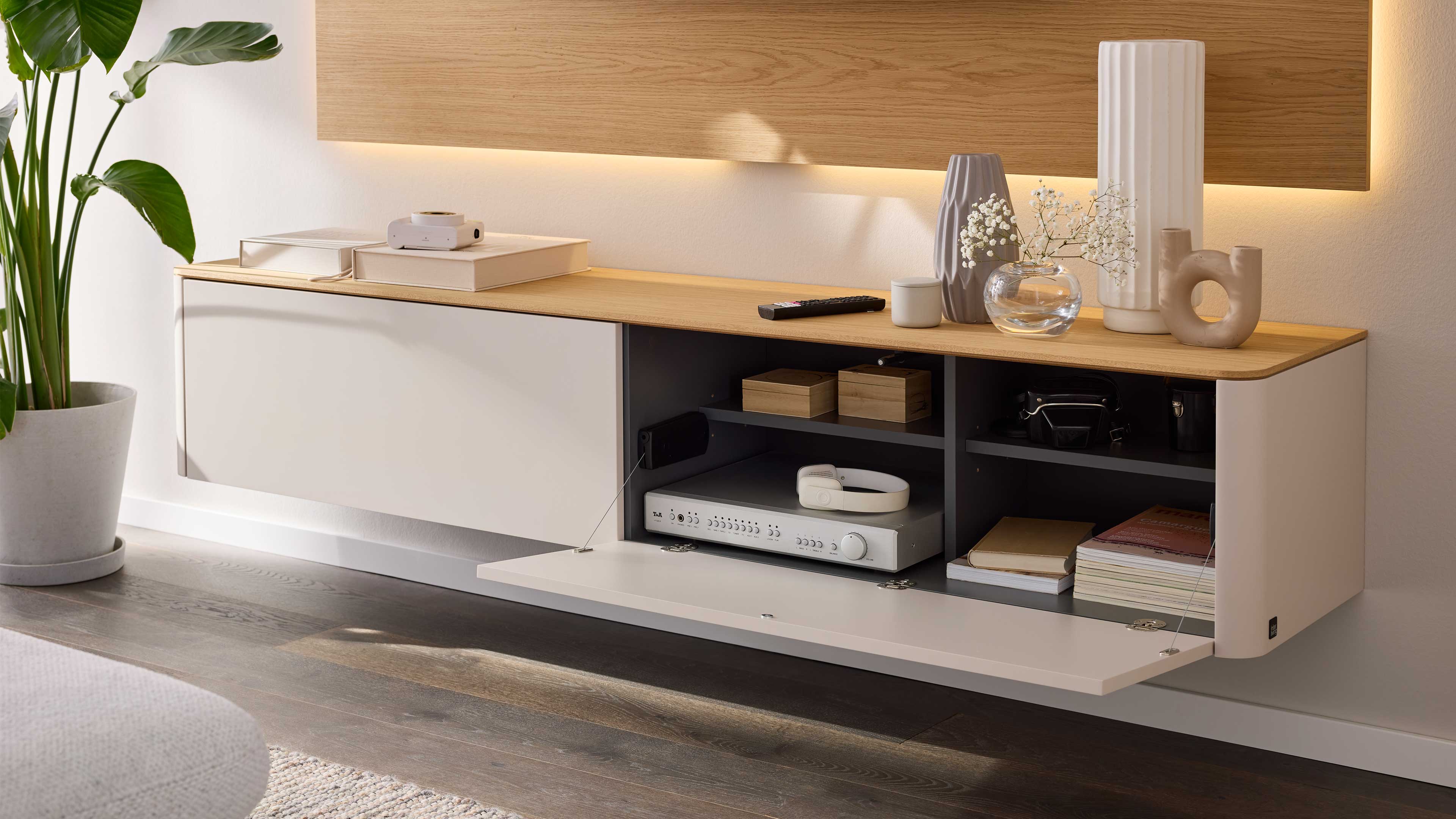Modernes TV-Lowboard in Weiß mit Holzrückwand und klarer Linienführung