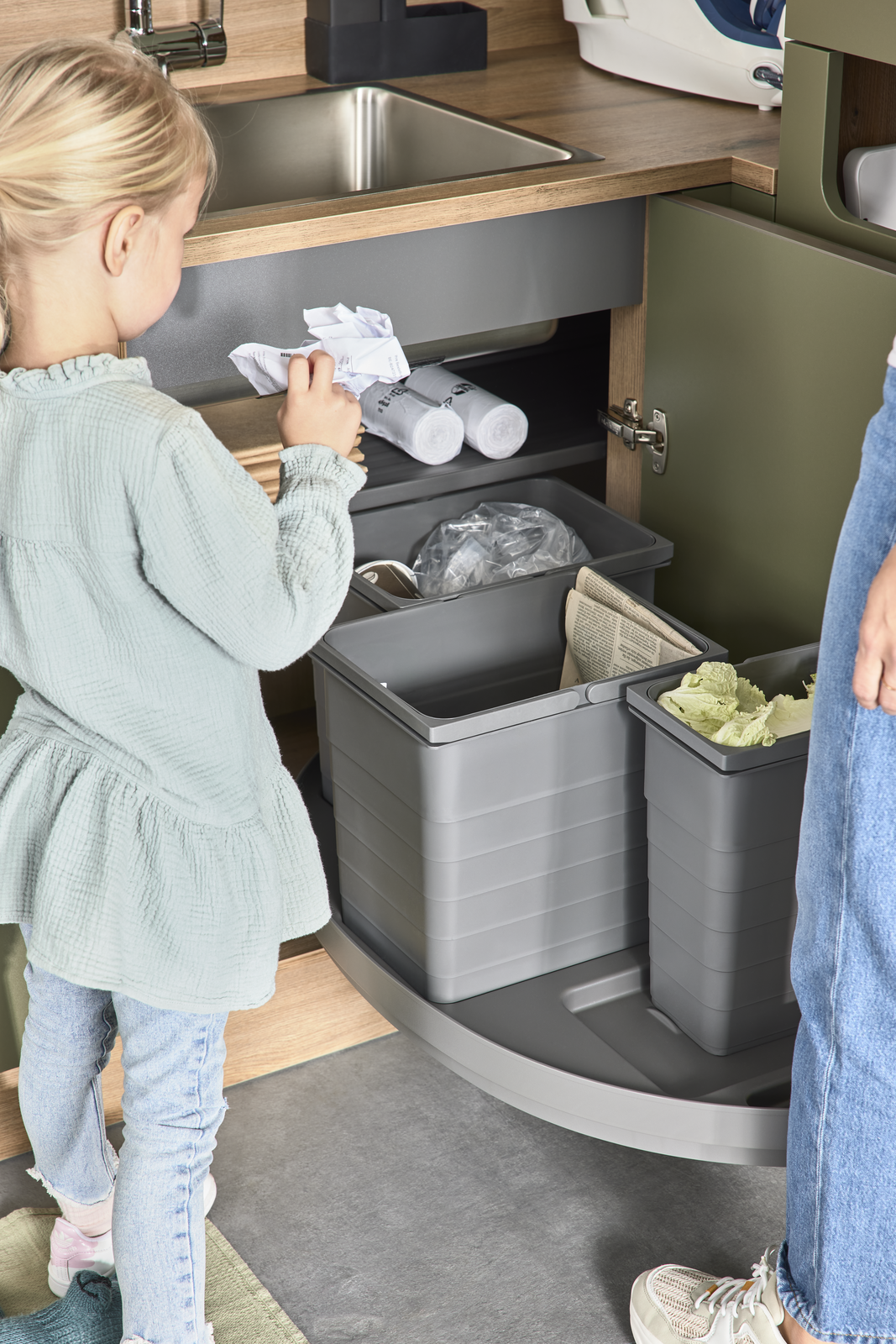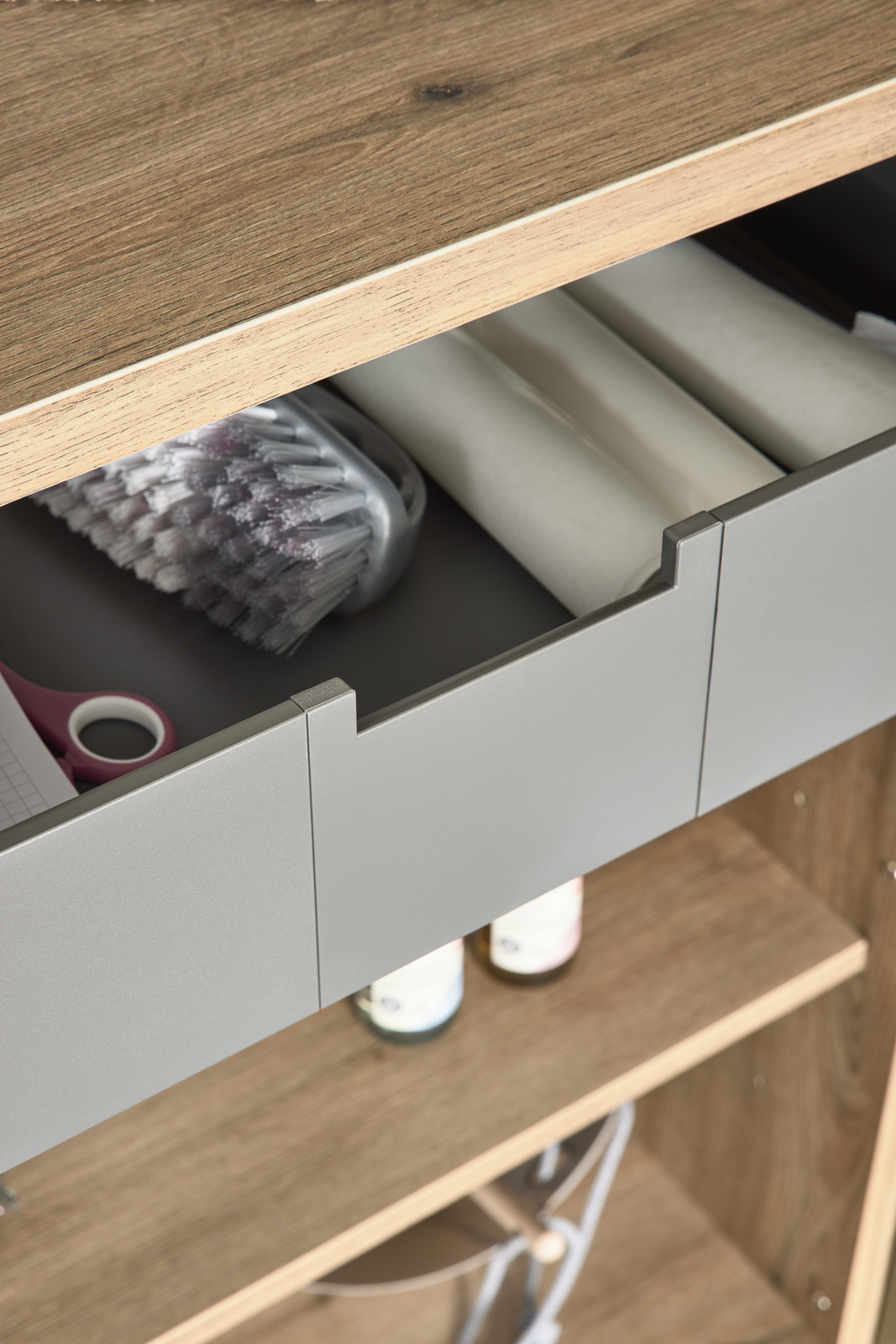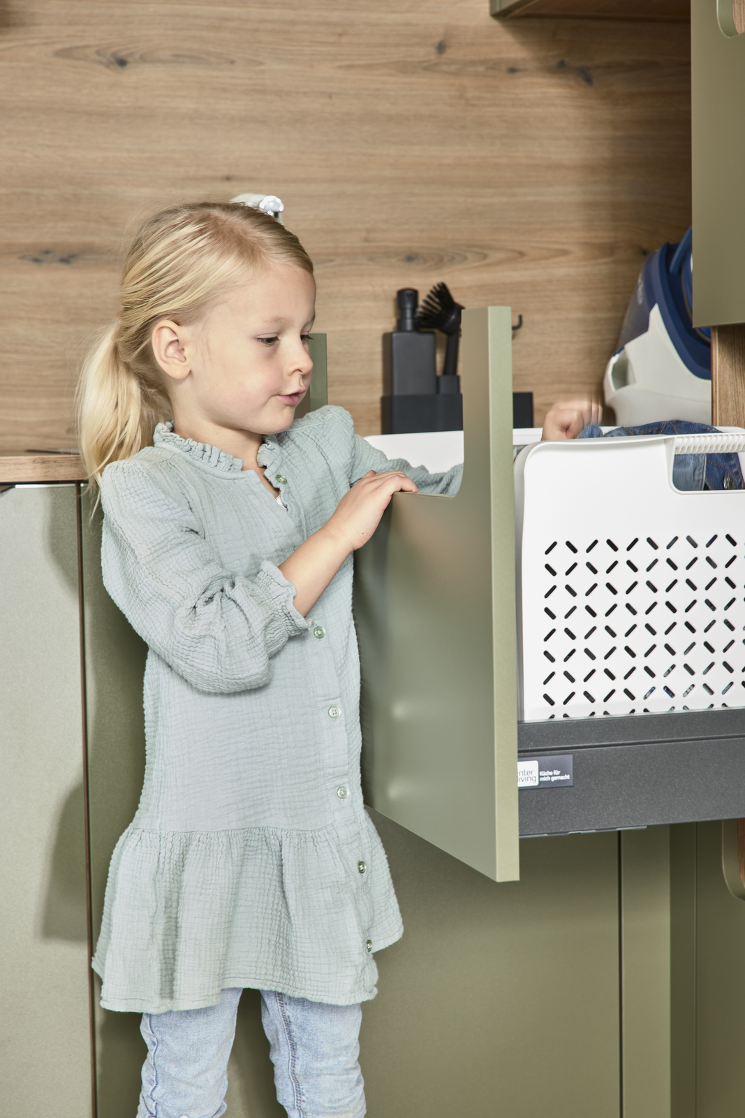 Ein Hauswirtschaftsraum muss nicht nach „Abstellkammer“ aussehen. Mit Interliving kannst du deine Küche und deinen Hauswirtschaftsraum in derselben Farbe gestalten. Ein besonderes Highlight ist die Möglichkeit, eine verdeckte, flächenbündige Tür direkt in die Küchenfront zu integrieren. Von außen zeigt sich eine durchgehende Küchenzeile und die Tür ist optisch unsichtbar. Dahinter eröffnet sich der direkte Zugang zum Hauswirtschaftsraum. Vorräte, Geräte oder Wäsche verschwinden im Hintergrund und bleiben diskret verborgen. Das Ergebnis ist ein cleanes, minimalistisches Küchendesign, das Ästhetik und Funktionalität perfekt verbindet. Gerade in offenen Wohnkonzepten ist diese Lösung ideal: Arbeitsbereiche bleiben unsichtbar, sind aber jederzeit schnell erreichbar.