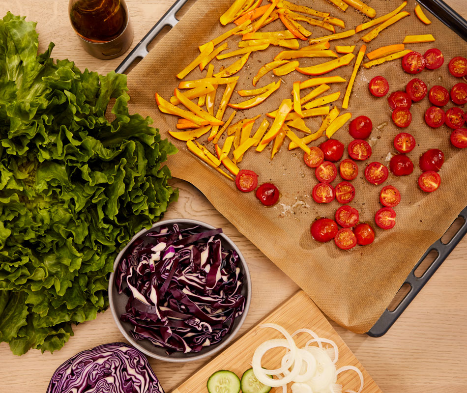 Mhmmm… der Duft von frisch gebackenem Fladenbrot, knackiger Salat, cremige Soßen und dazu goldbraun gebratene Kürbisspalten.