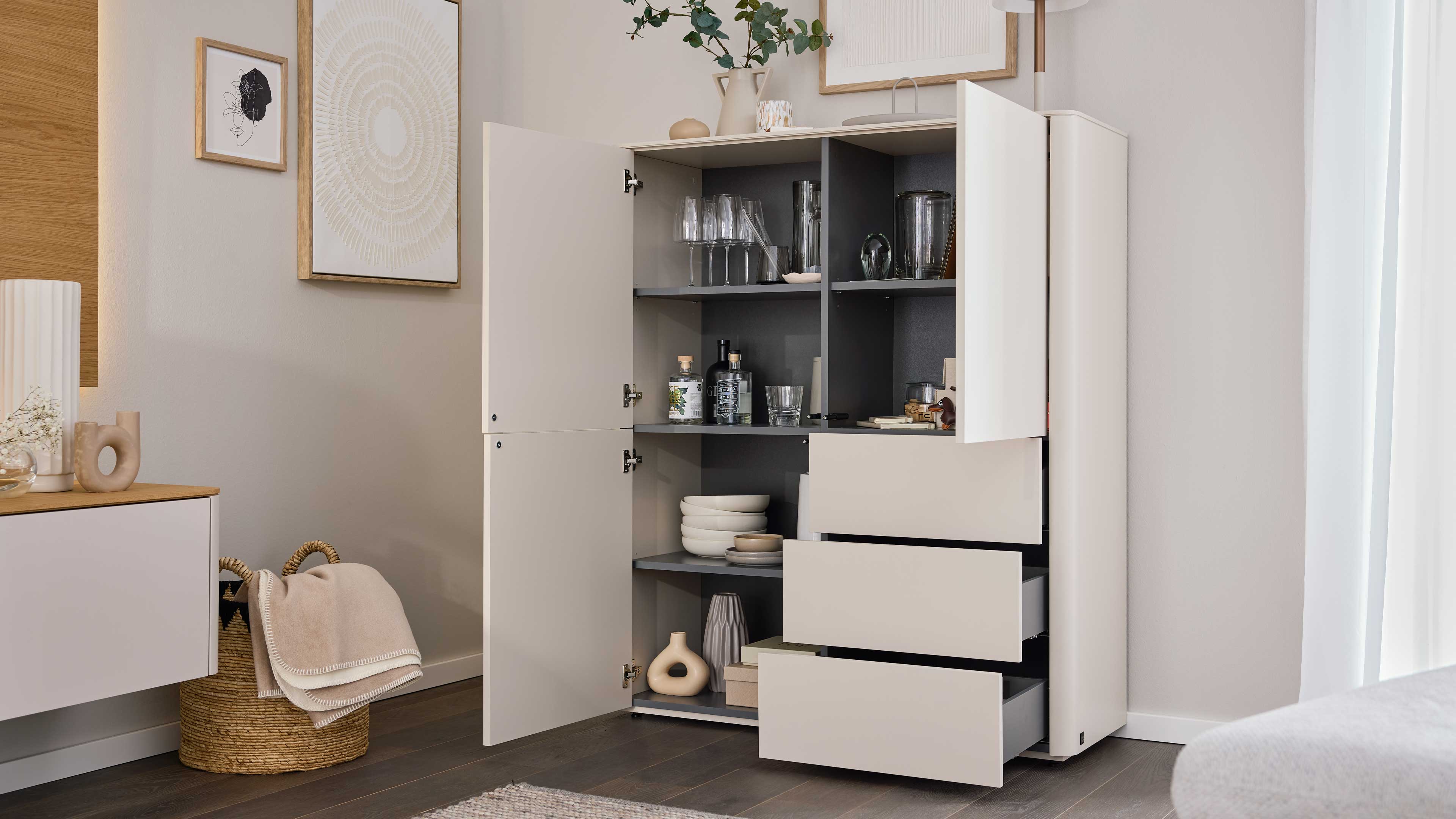 Wenn du deinen Wohnraum stimmig gestalten möchtest, kombiniere den Stauraumschrank mit passenden Elementen der Serie – etwa Wohnwänden, Sideboards oder Wandpaneelen. Besonders wirkungsvoll ist die optionale integrierte LED-Beleuchtung in Nischen und Wandpaneelen, die gegen Mehrpreis erhältlich ist. Sie sorgt für stimmungsvolles Licht und lässt sich bequem per Touchschalter oder App steuern.