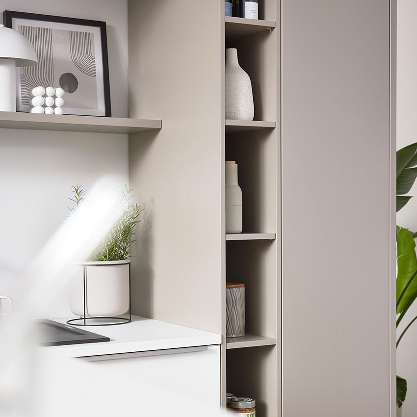 Doch echte Individualität entsteht erst im Zusammenspiel aller Elemente. Griffe für Küchen setzen gezielte Akzente oder ermöglichen eine grifflos geplante Optik, während die passende Arbeitsplatte Design, Alltagstauglichkeit und Langlebigkeit vereint. Dank der großen Auswahl an Fronten, Griffen und Arbeitsplatten lässt sich jede Interliving Küche individuell nach deinem Geschmack planen!