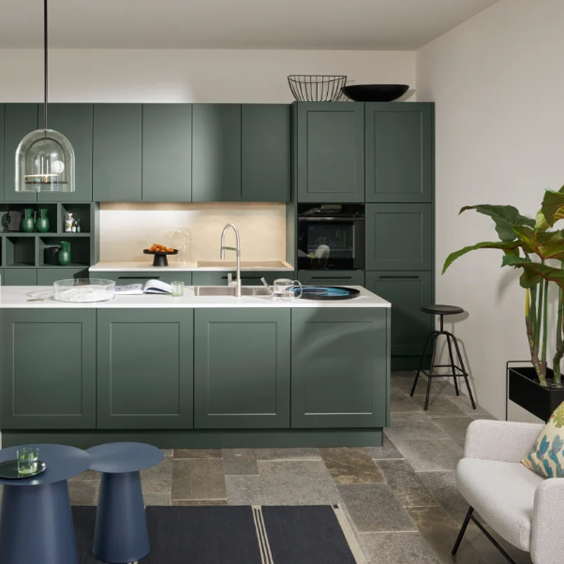 Das Interliving Fronten Programm 3440 verbindet traditionelle Rahmenoptik mit einer ruhigen, matten Oberfläche und schafft so eine zeitlos elegante Landhausküche. Die dezente Kontur und harmonische Farbwelt sorgen für eine warme, stilvolle Ausstrahlung in Küche, Wohn- und Essbereich.