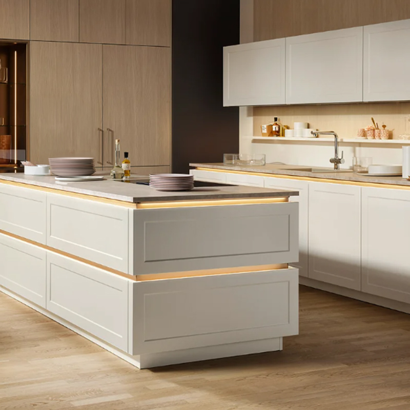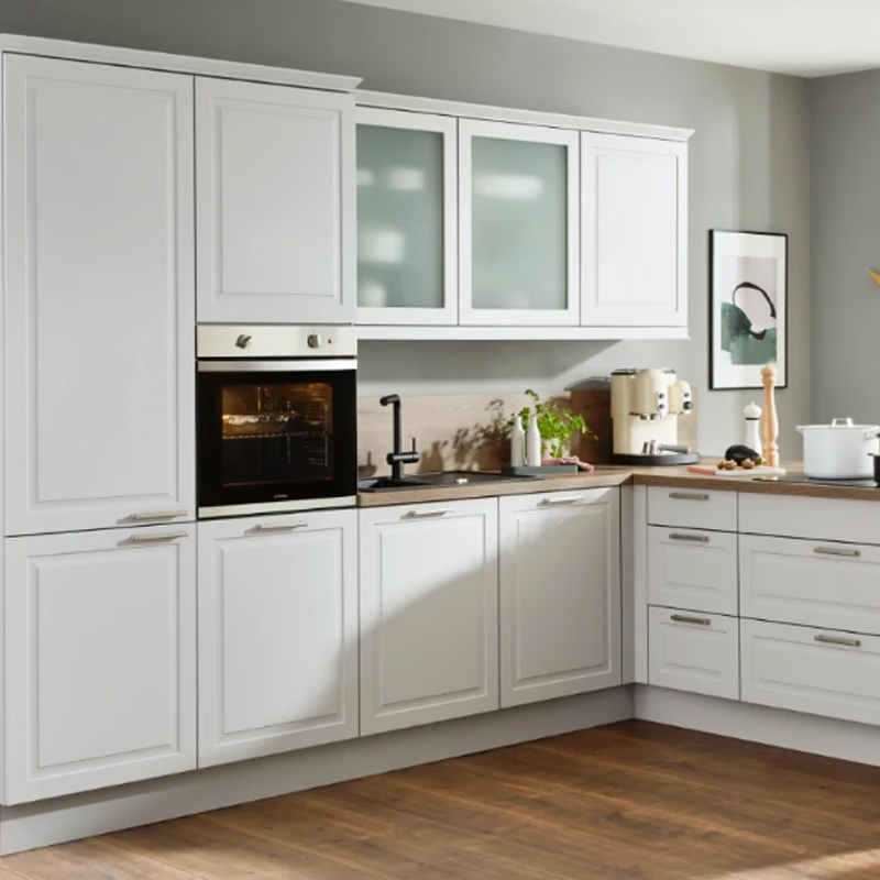 Das Interliving Fronten Programm 3390 steht für authentische Landhausküchen mit traditioneller Rahmenoptik und angenehm matter Oberfläche. In Weiß, Magnolia oder Platingrau entsteht eine zeitlose, wohnliche Atmosphäre, die sich harmonisch mit modernen Elementen kombinieren lässt und klassische Eleganz neu interpretiert.