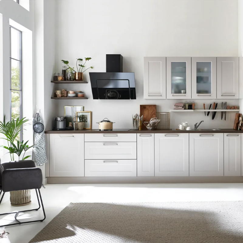 Das Interliving Fronten Programm 3380 verbindet klassische Rahmenfronten mit einer ruhigen, softmatten Oberfläche und interpretiert den Landhausstil zeitgemäß neu. In Weiß softmatt, Magnolia softmatt oder Platingrau softmatt entsteht eine wohnliche, elegante Atmosphäre, die traditionelle Elemente mit moderner Zurückhaltung kombiniert.
