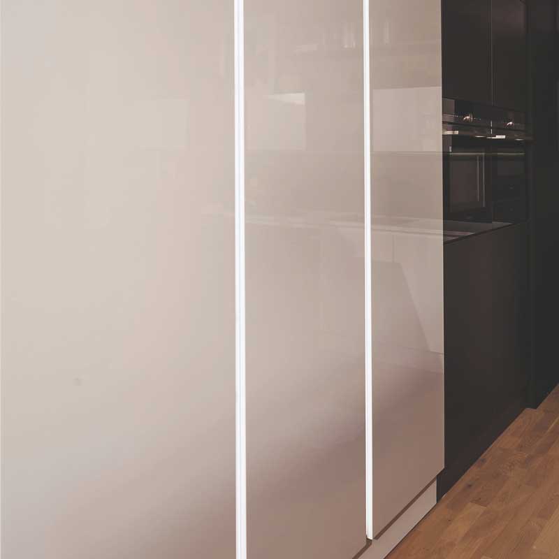 Das Interliving Fronten Programm 3530 kombiniert hochglänzenden Echtlack mit einer direkt in die Front integrierten Griffspur und schafft so eine durchgängige, grifflose Optik mit besonders klarer Linienführung. Die stark reflektierende Oberfläche sorgt für elegante Lichtakzente und eine großzügige, edle Raumwirkung..