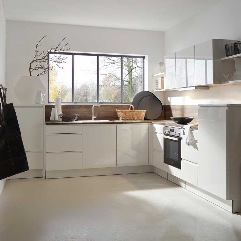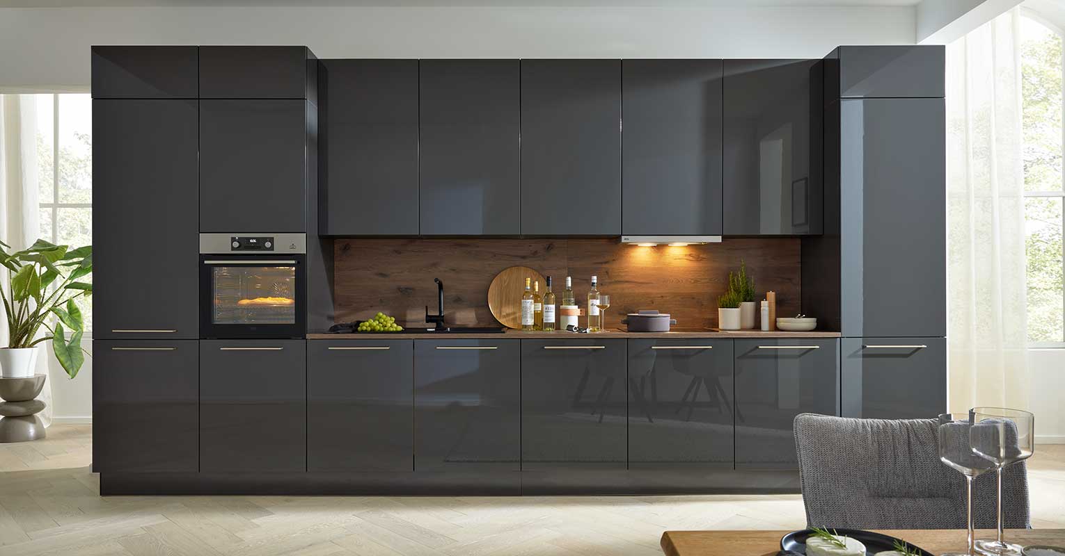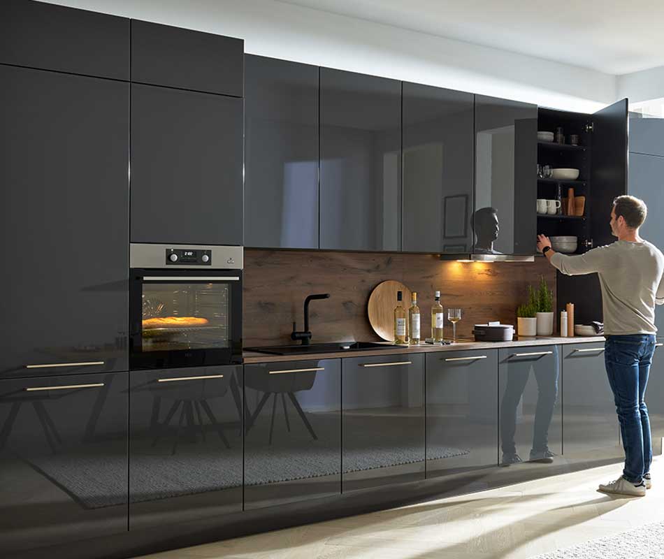 Das Interliving Fronten Programm 3230 bringt mit seiner hochglänzenden Lacklaminat-Oberfläche sichtbare Tiefe und exklusive Lichtreflexe in dein Zuhause. Die glatte, reflektierende Front sorgt für eine großzügige Raumwirkung und verleiht Küche, Wohn- und Essbereich eine stilvolle, zeitlose Eleganz.