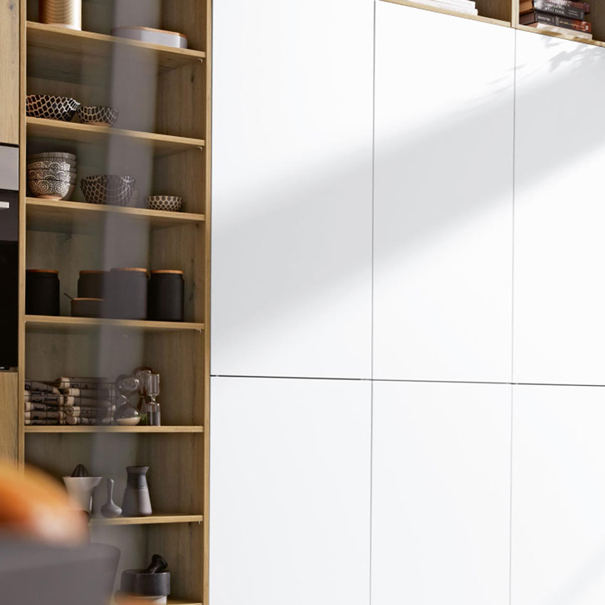 Das Interliving Fronten Programm 3205 überzeugt mit eleganter, softmatter Lackoptik, samtiger Haptik und Anti-Fingerprint-Oberfläche für ein dauerhaft gepflegtes Erscheinungsbild. Zeitlose Farben und die Möglichkeit ohne Griffe zu planen, verbinden modernes Design mit hoher Alltagstauglichkeit.