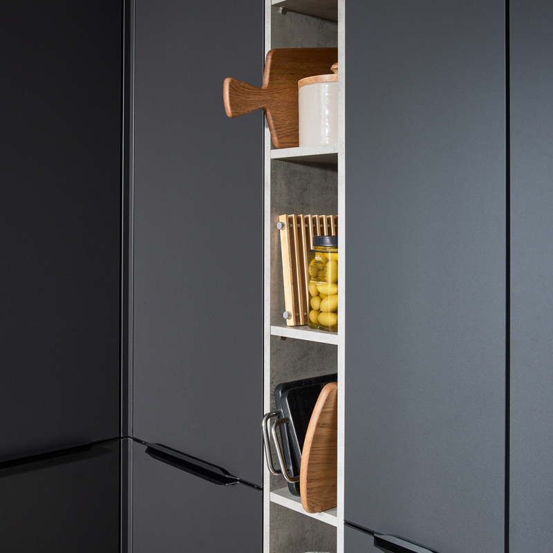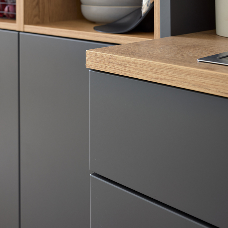 Das Interliving Fronten Programm 3205 überzeugt mit eleganter, softmatter Lackoptik, samtiger Haptik und Anti-Fingerprint-Oberfläche für ein dauerhaft gepflegtes Erscheinungsbild. Zeitlose Farben und die Möglichkeit ohne Griffe zu planen, verbinden modernes Design mit hoher Alltagstauglichkeit.