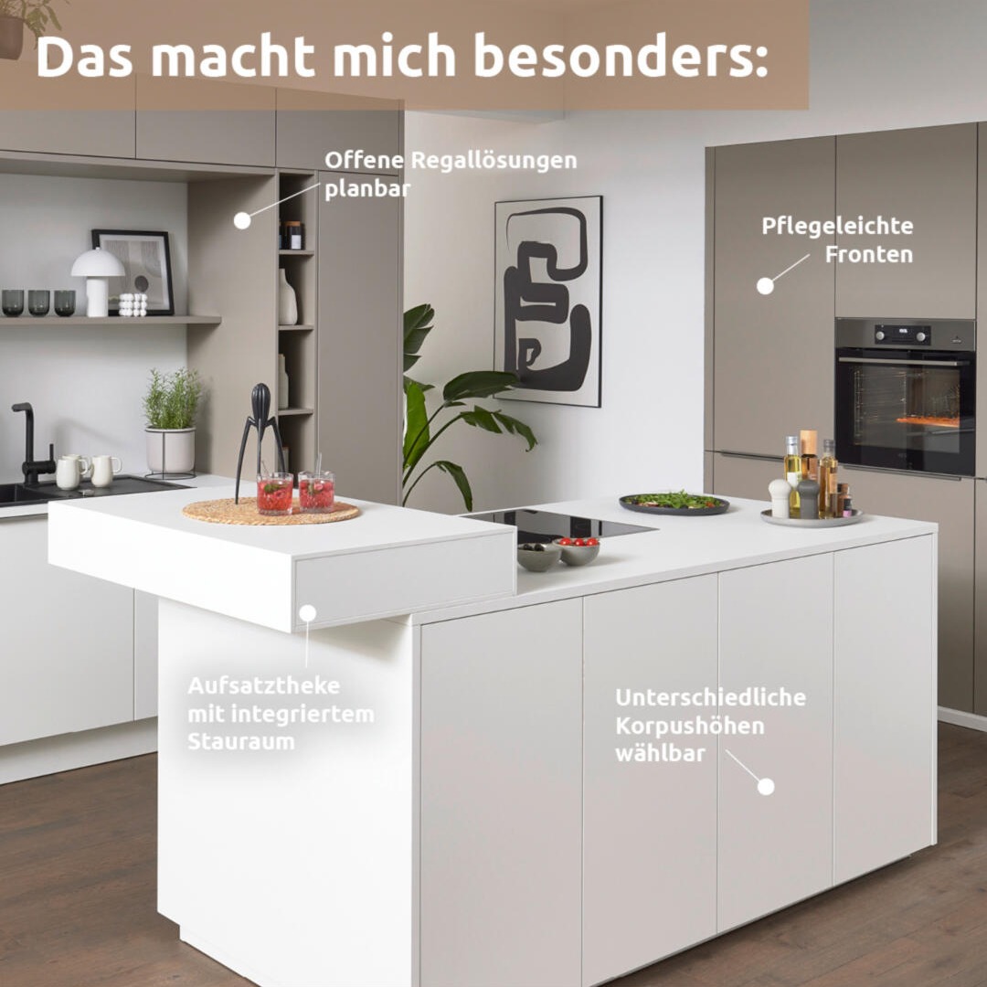 Die Interliving Küche Serie 3079 bringt zeitgemäßes Küchendesign auf den Punkt. Mit harmonisch abgestimmten Farben, eleganter Linienführung und cleveren Stauraumlösungen wird sie zur Wohlfühloase im Herzen deines Zuhauses. Ob großzügige Insel mit Aufsatztheke, geräumiges Hochschrankelement oder praktische Auszüge mit Softeinzug: Die individuelle Planbarkeit lässt dir alle Freiheiten bei Farbe, Aufbau und Ausstattung. Und mit hochwertigen Elektrogeräten sowie 5 Jahren Hersteller-Garantie kannst du dich auf echte Qualität verlassen.