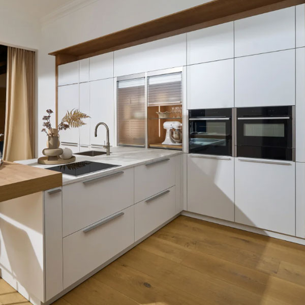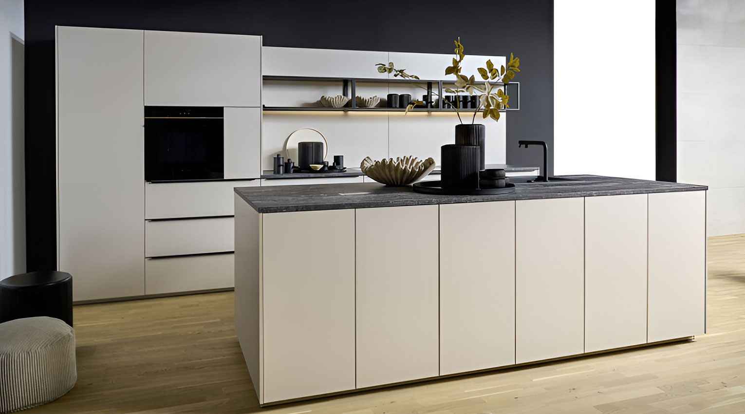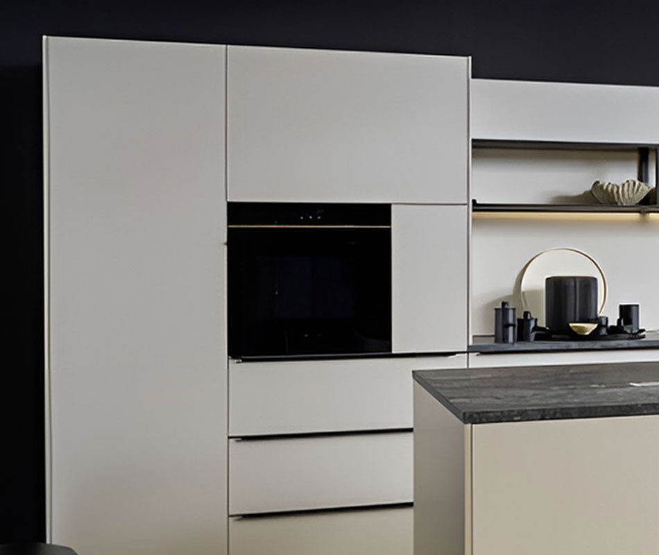 Das Interliving Fronten Programm 3750 vereint elegante Acrylglas-Optik mit moderner Anti-Fingerprint-Technologie und schafft so eine Front, die Design und Alltagstauglichkeit harmonisch verbindet. Die feine Metallic-Struktur in Weiß, Sand, Taupe oder Umbra metallic sorgt für eine sanft schimmernde Tiefenwirkung und verleiht der Küche eine helle, luxuriöse Ausstrahlung.