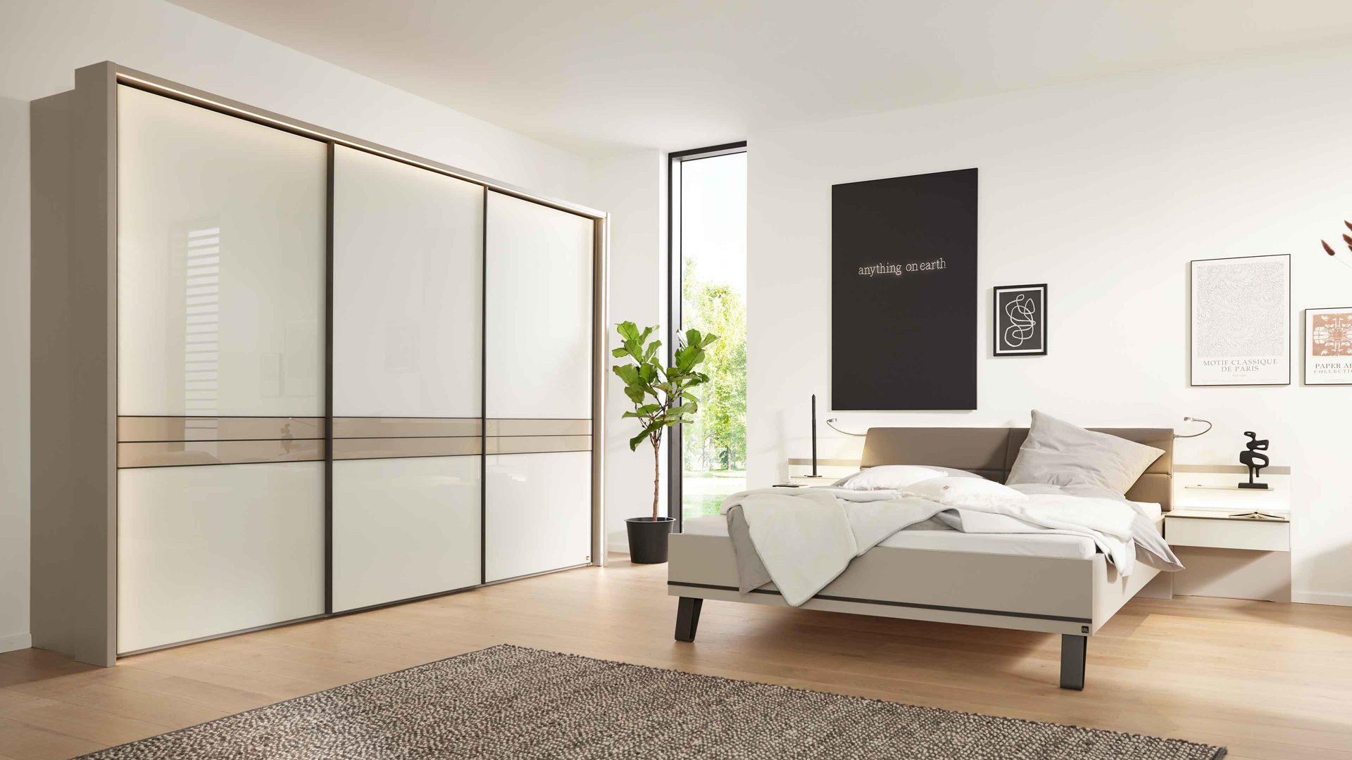 Das Komplettzimmer 006 aus der Interliving Schlafzimmer Serie 1032 kombiniert helle, freundliche Glasfronten in Weiß und Kieselgrau mit pflegeleichten Kunststoffoberflächen zu einem zeitgemäßen Look. Das havannafarbene Kunstleder am Polsterkopfteil und schieferfarbene Metall-Details setzen stilvolle Akzente, während das silbergrau gestreifte Innendekor für einen eleganten Kontrast sorgt.