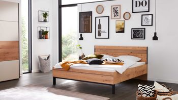 Das Bettgestell 86438 aus der Interliving Schlafzimmer Serie 1024 kombiniert Echtholz-Balkeneichefurnier mit robusten anthrazitfarbenen Metall-Winkelfüßen.