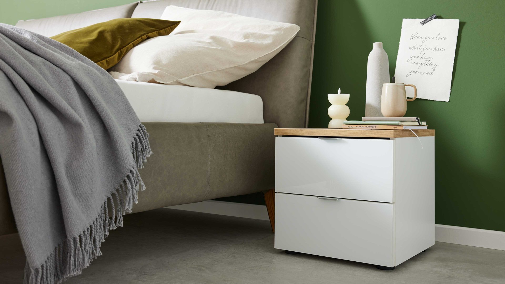 Mit ihren puristisch alpinweißen Glasfronten und dem stilvollen Oberboden in Artisan-Eiche-Nachbildung bringt die Nachtkommode 86717 aus der Interliving Kleiderschrank Serie 1208 moderne Extravaganz in Ihr Schlafzimmer.