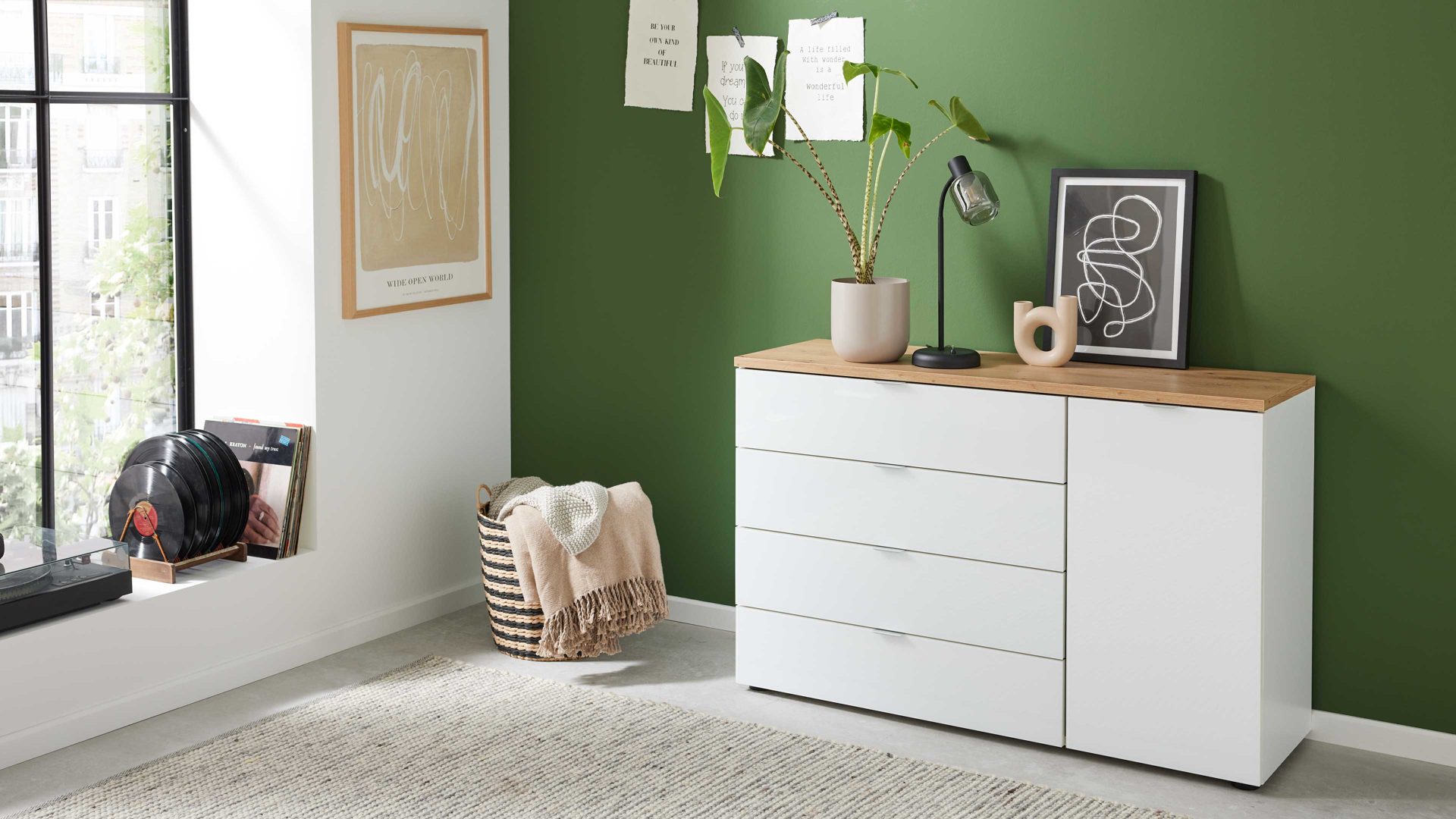 Die Tür mit einem höhenverstellbaren Einlegeboden und die vier geräumigen Schubladen schließen dank Soft-Close beziehungsweise Softeinzug besonders leise und sorgen damit für eine überaus angenehme Handhabung.