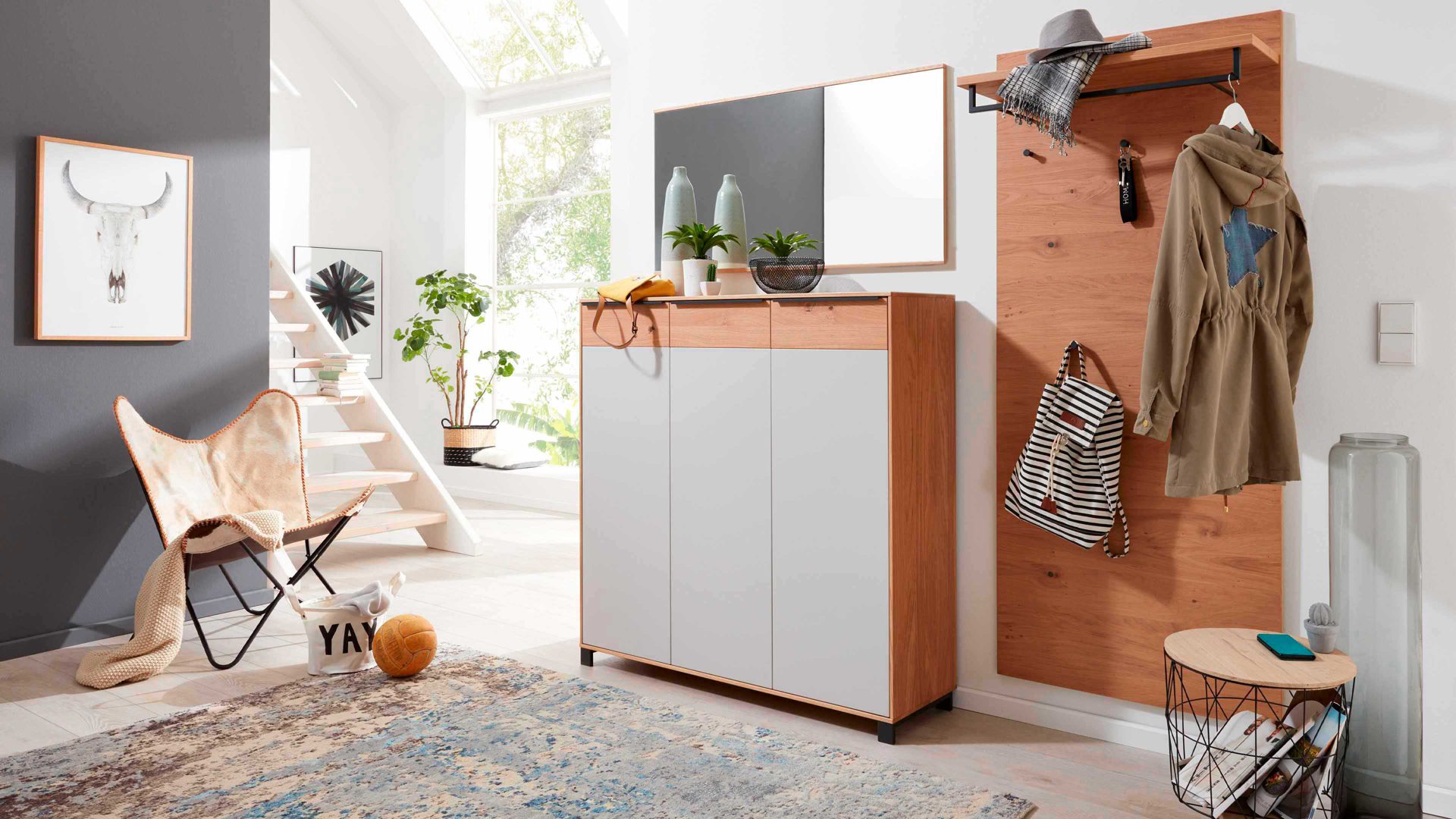Diese Merkmale kennzeichnen das dreiteilige Garderoben-Set 1 aus der Interliving Garderoben Serie 6005, das aus einer Schuhkommode, einer Wandgarderobe und einem Spiegel besteht. Während die Korpusse der Garderobenmöbel in teilmassiver, biancofarbener Eiche gestaltet sind, präsentieren sich die Fronten mit Balkeneichefurnier und zum Teil auch mit lichtgrauer Lackoberfläche. Letztere erwirkt einen edlen Akzent. Stilvoll und robust abgerundet werden die Elemente durch verschiedene metallene Details im trendigen Farbton Anthrazit.