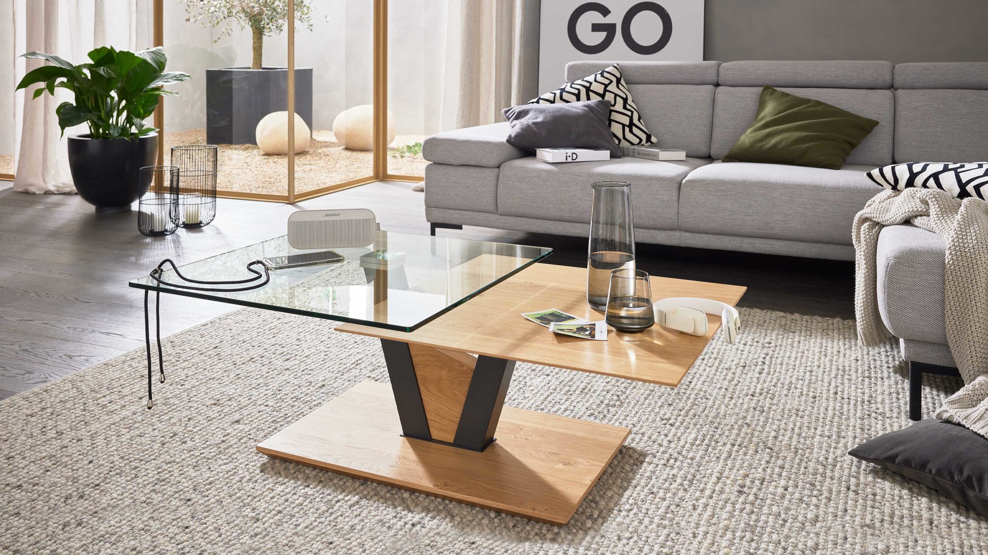 Der Couchtisch aus der Interliving Couchtisch Serie 6224 kombiniert lackiertes Wildeichefurnier mit Klarglas, anthrazit-metallic- und silberfarben lackierten Metallelementen sowie einer MDF-Bodenplatte.