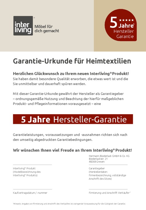 Die Wohndecke ist besonders pflegeleicht: Du kannst sie im Schonwaschgang bei bis zu 30 °C reinigen und an der Luft trocknen lassen. Sie wird in Deutschland produziert und steht für höchste Verarbeitungsqualität und nachhaltige Herstellung. Mit 5 Jahren Herstellergarantie bietet die Interliving Wohndecke Serie 9103 dir langlebige Qualität und verlässlichen Komfort.